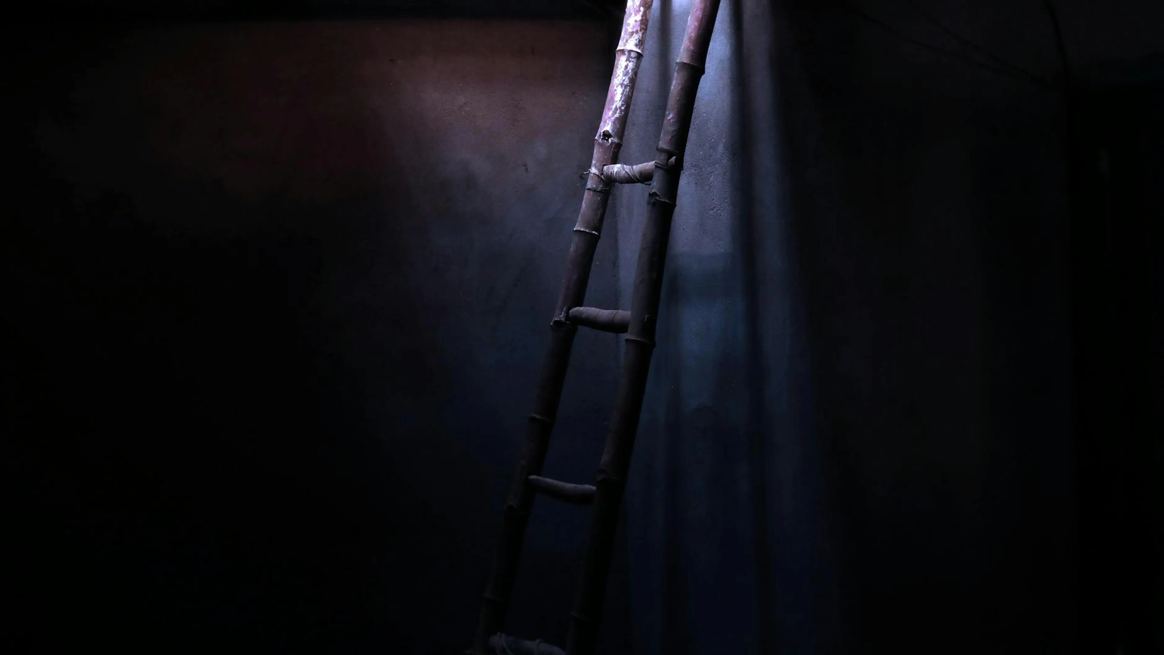 A bamboo ladder stands against a dark backdrop with minimal lighting, creating a