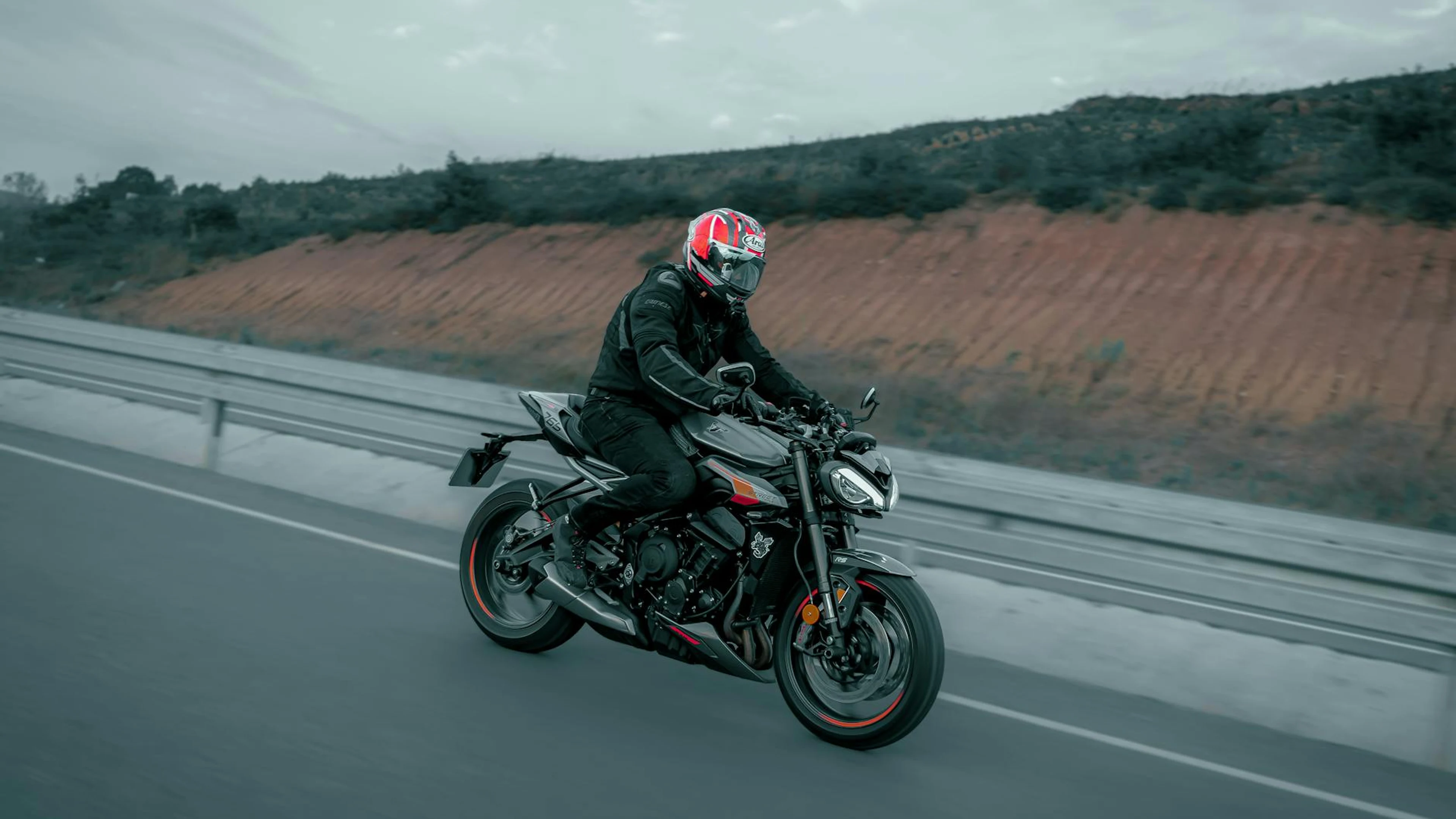A biker on a black motorcycle cruising along an open highway, showcasing speed a