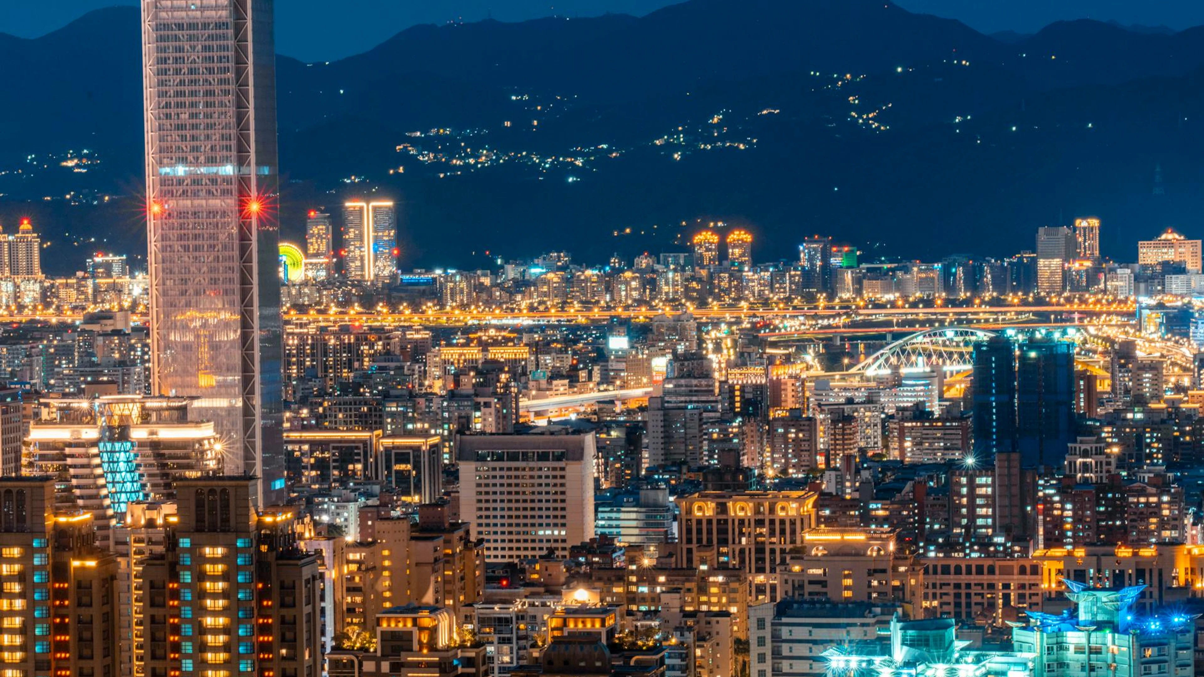 Free A breathtaking aerial view of a city skyline at night with illuminated skyscrape wallpaper in 4K Ultra HD resolution (3840x2160). Beautiful city background for your screen. No signup required.