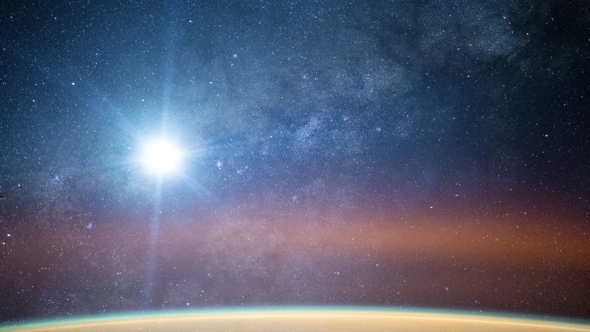 Download A bright airglow blankets Earth's horizon as the Milky Way illuminates the night wallpaper for free. 1920x1080 tablet resolution, perfect for your desktop. High quality space wallpaper.