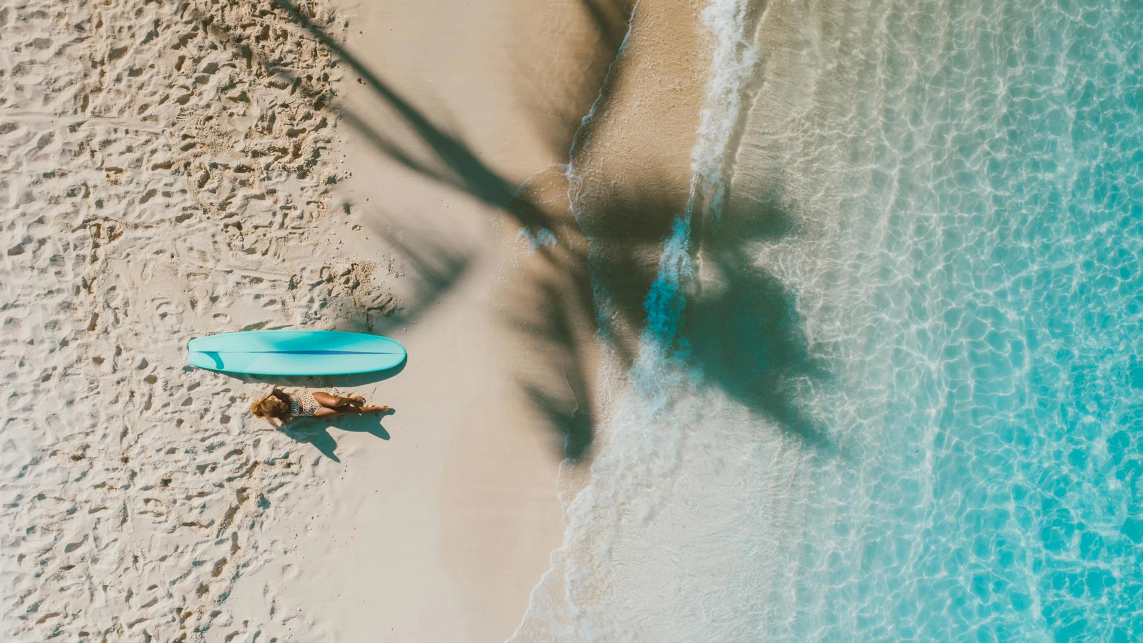 Get this stunning A captivating aerial photo of a woman relaxing by her surfboard on a sunlit sand wallpaper in 4K Ultra HD quality. 3840x2160 ocean wallpaper available for free download.