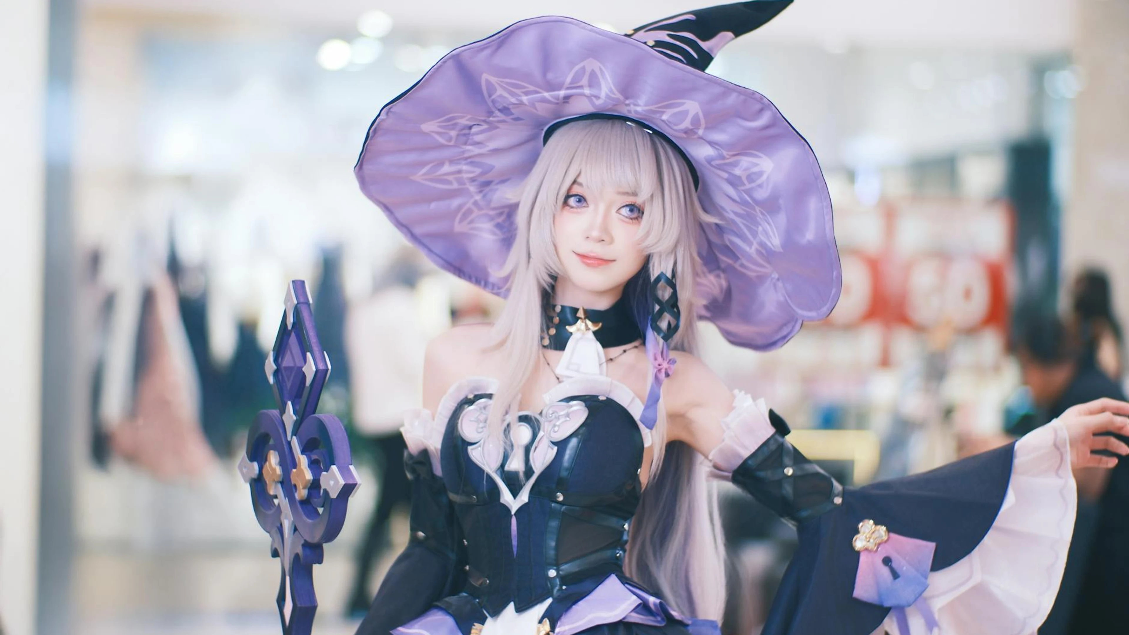 A captivating fantasy-themed cosplay of a witch inside a shopping mall.