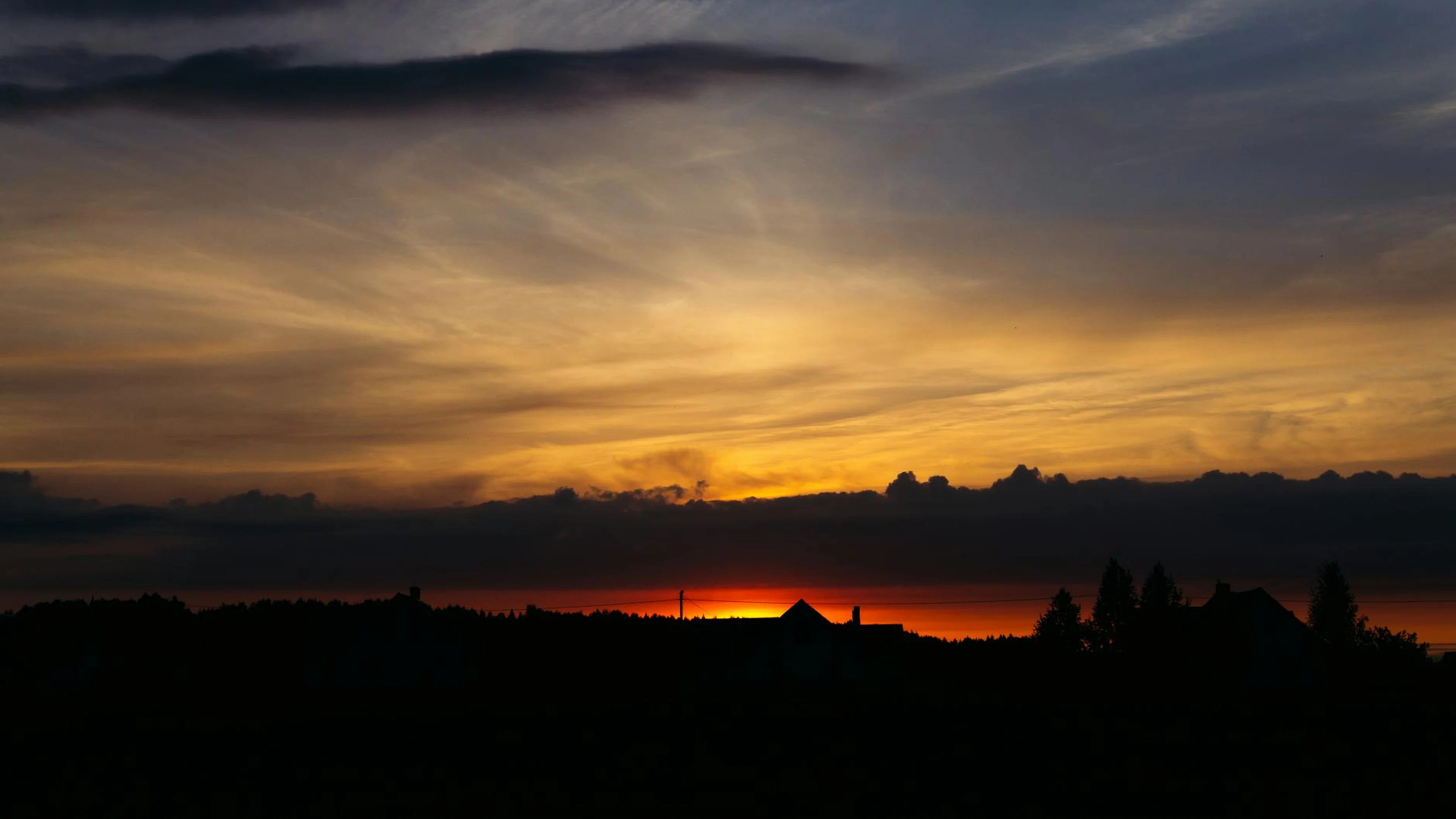 A captivating sunset with orange and dark clouds over silhouettes of trees and h