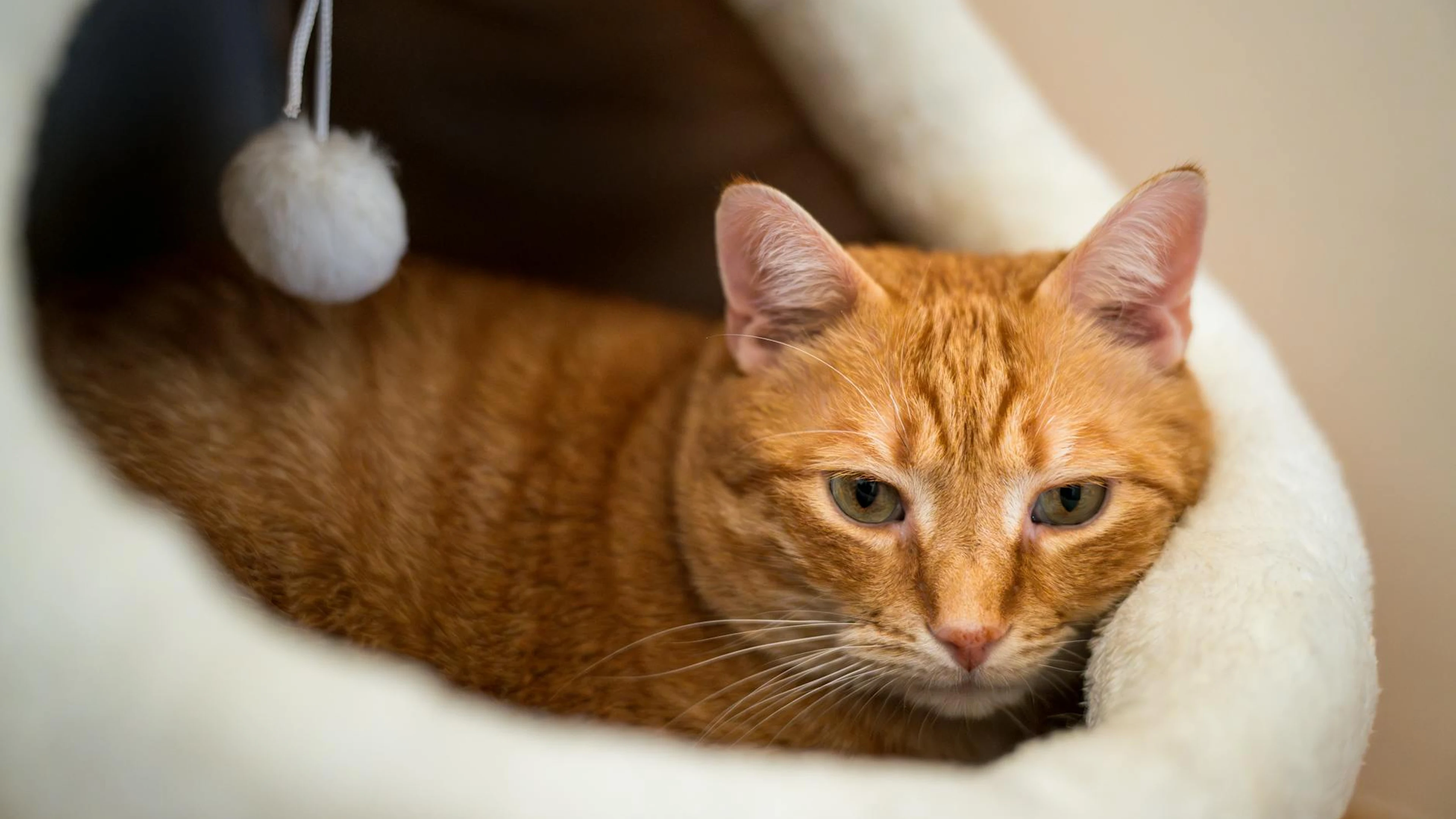 Free A charming ginger tabby cat comfortably nestled in a soft, cozy cat bed indoors. wallpaper in 4K Ultra HD resolution (3840x2160). Beautiful animals background for your screen. No signup required.