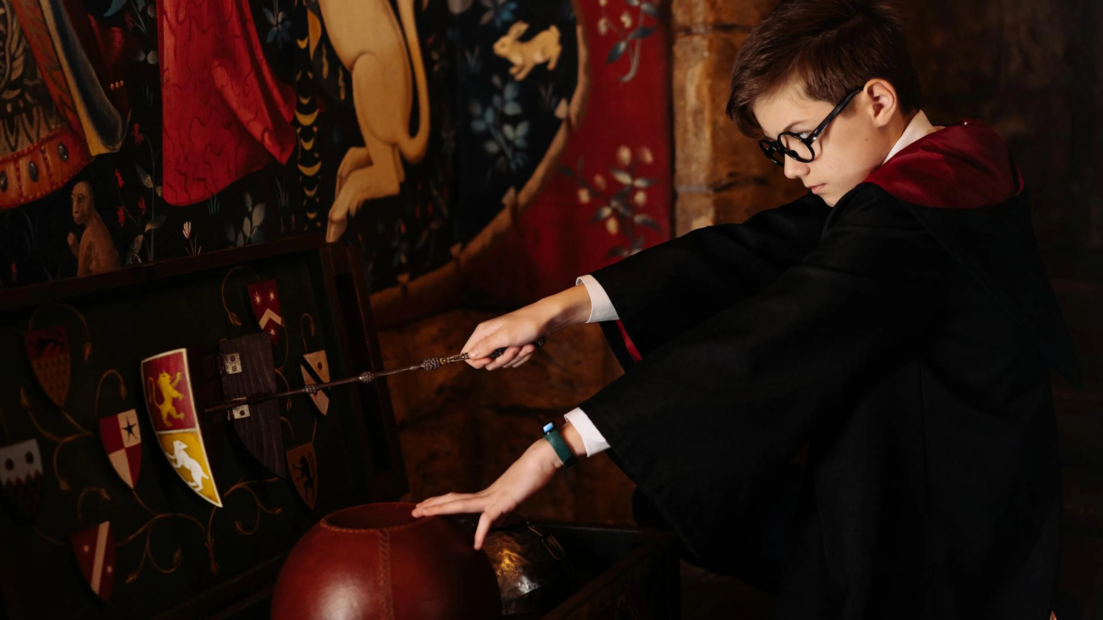A child dressed as a wizard holding a wand and engaging in fantasy play indoors. - free 4K Ultra HD fantasy wallpaper for desktop