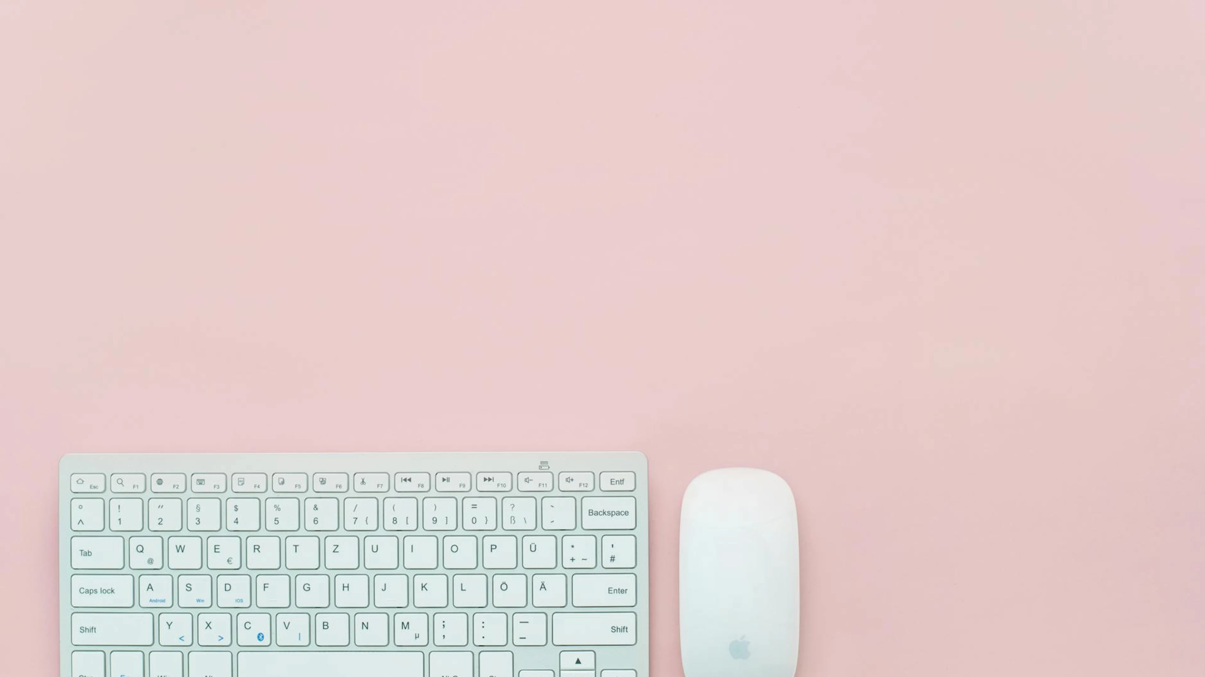 Download A clean and minimalist flat lay of a white keyboard and mouse on a pastel pink b wallpaper for free. 3840x2160 4K Ultra HD resolution, perfect for your desktop. High quality aesthetic wallpaper.