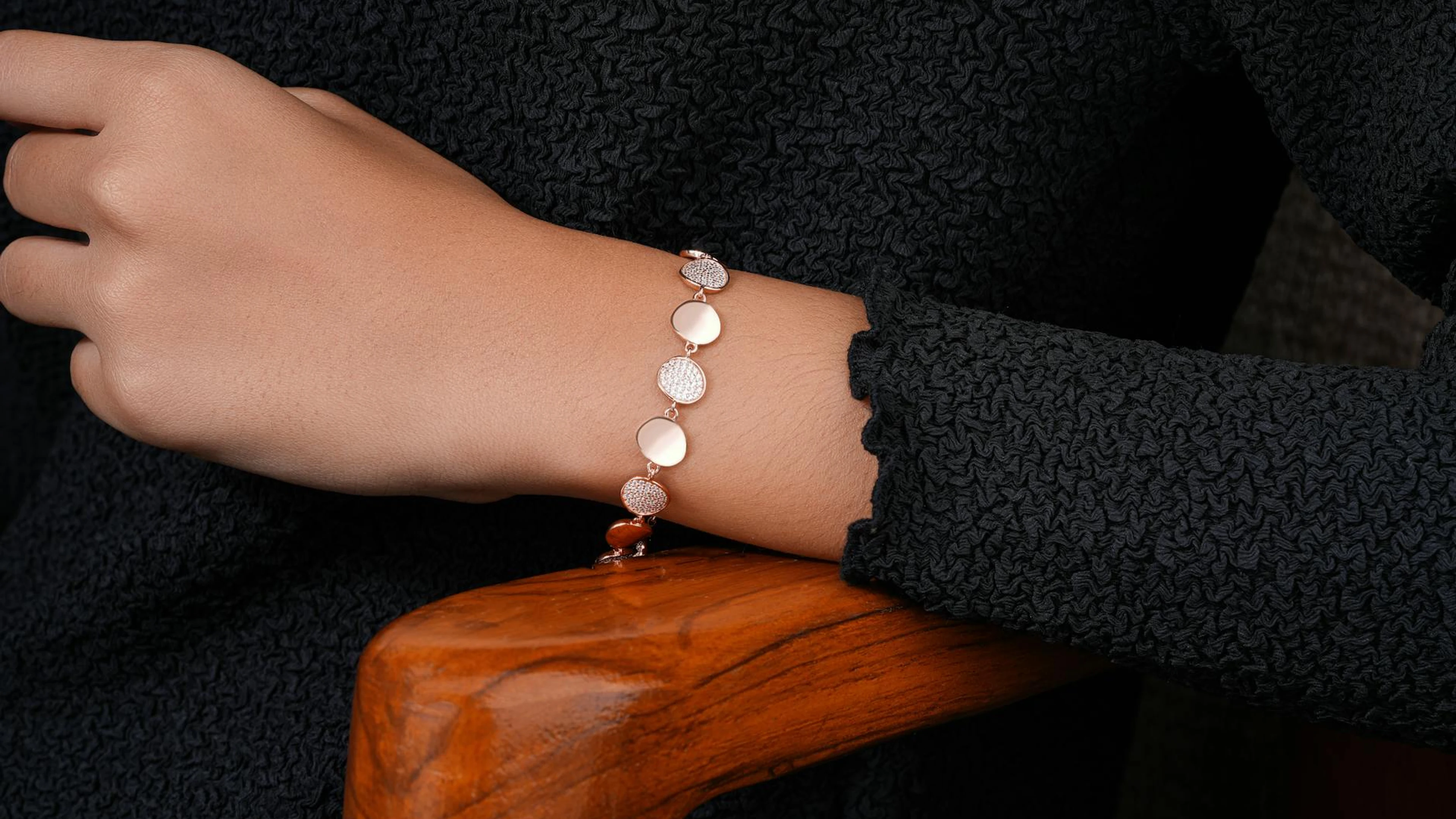 A close-up of a stylish bracelet on a woman's arm, showcasing fine jewelry detai