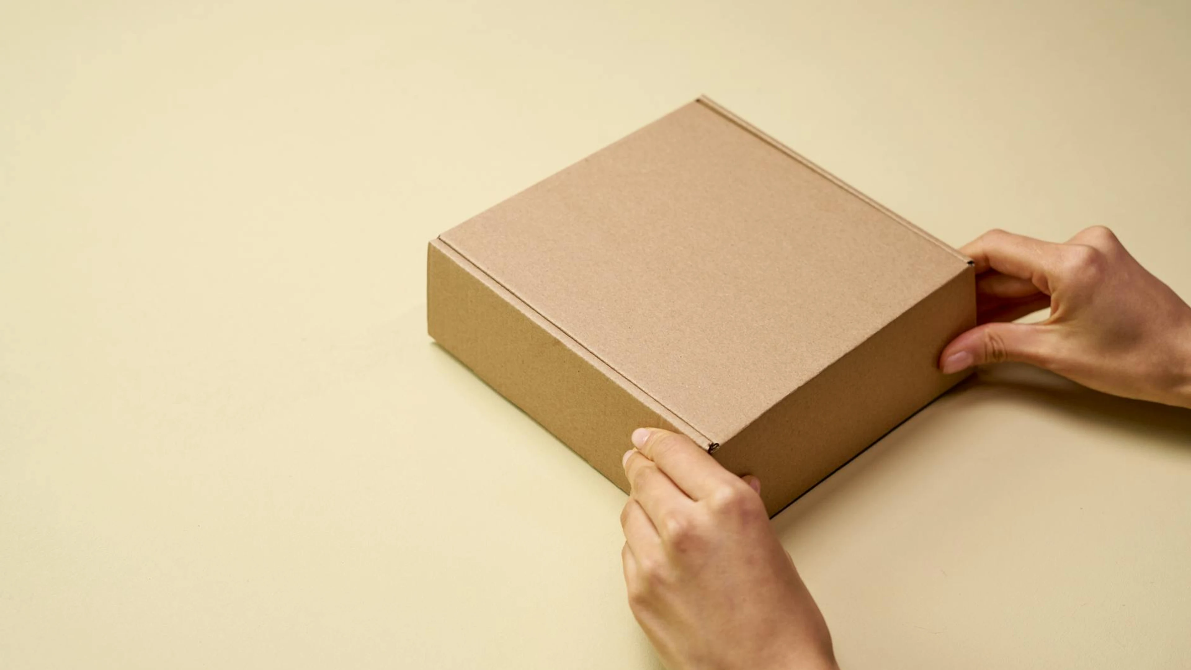 Download A close-up of hands opening a plain brown cardboard box on a beige surface, perf wallpaper for free. 3840x2160 4K Ultra HD resolution, perfect for your desktop. High quality minimal wallpaper.