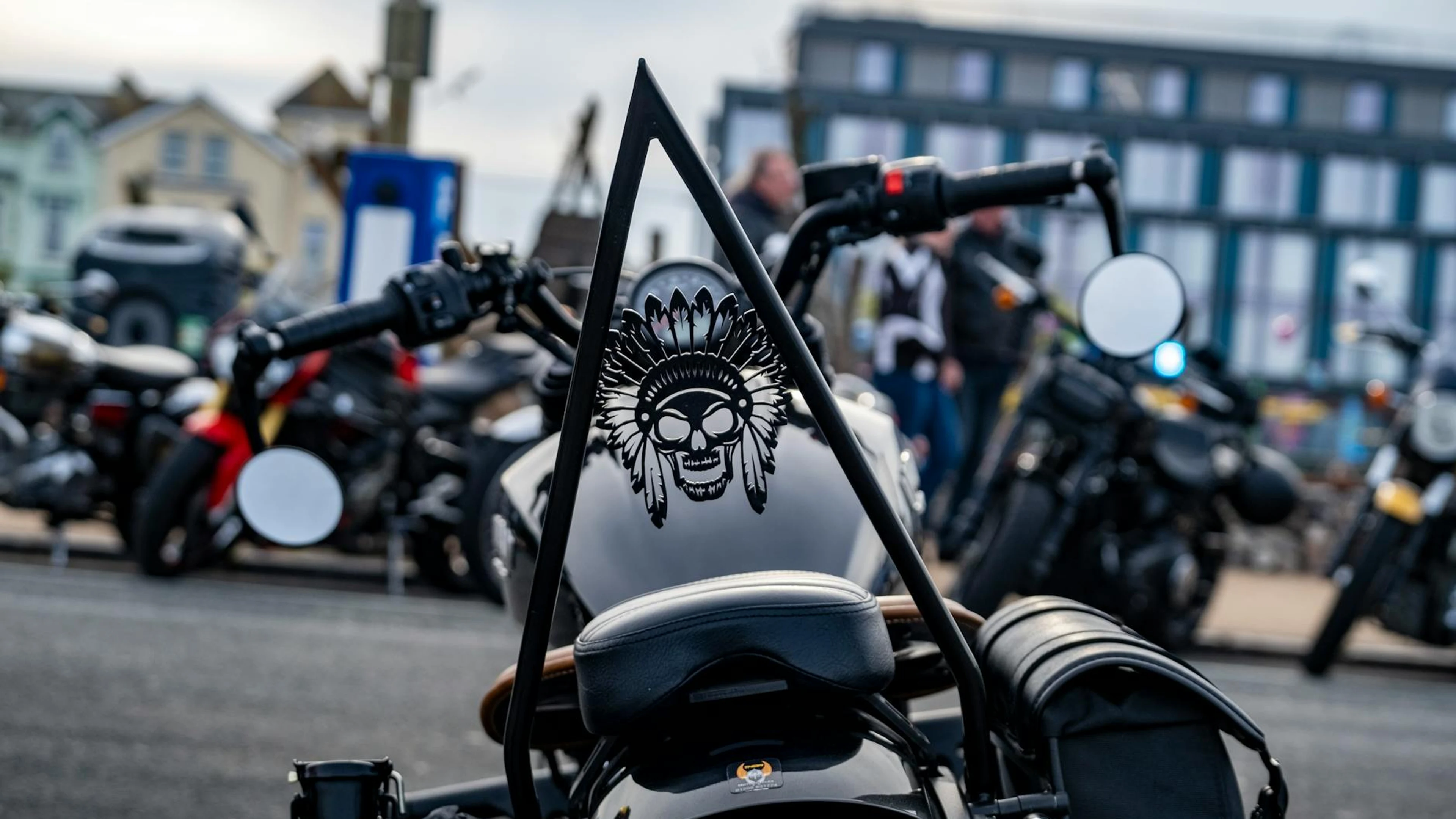 Detailed close-up of a classic motorcycle with a skull-themed decorative element