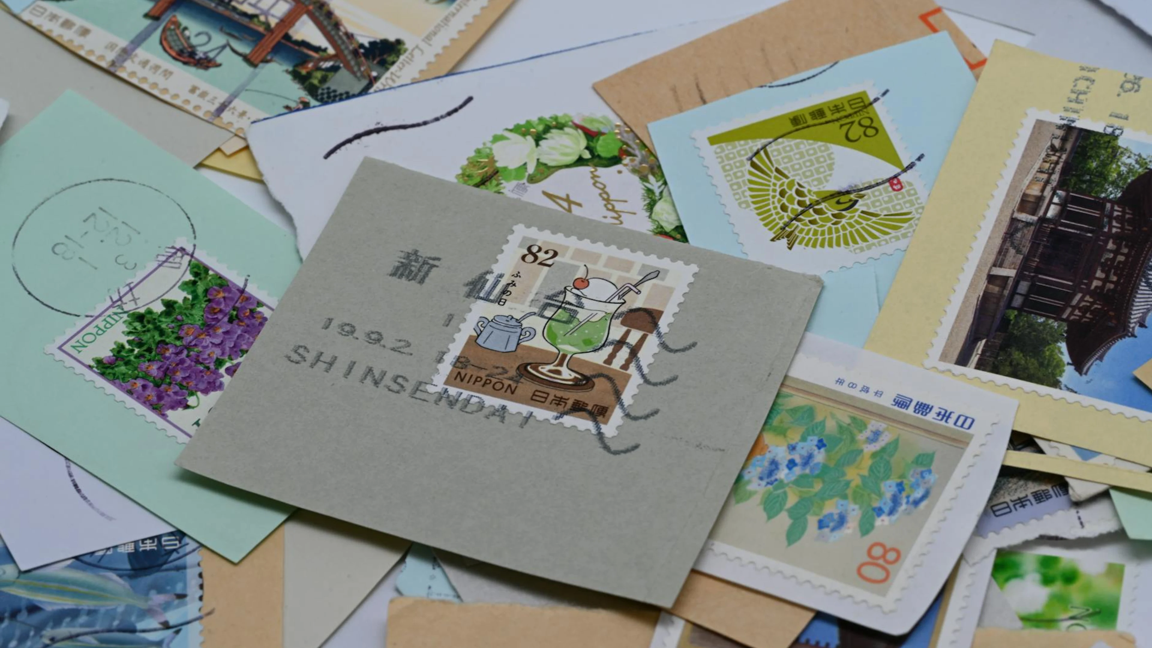 A diverse collection of colorful Japanese postage stamps featuring various desig - free 4K Ultra HD anime wallpaper for desktop