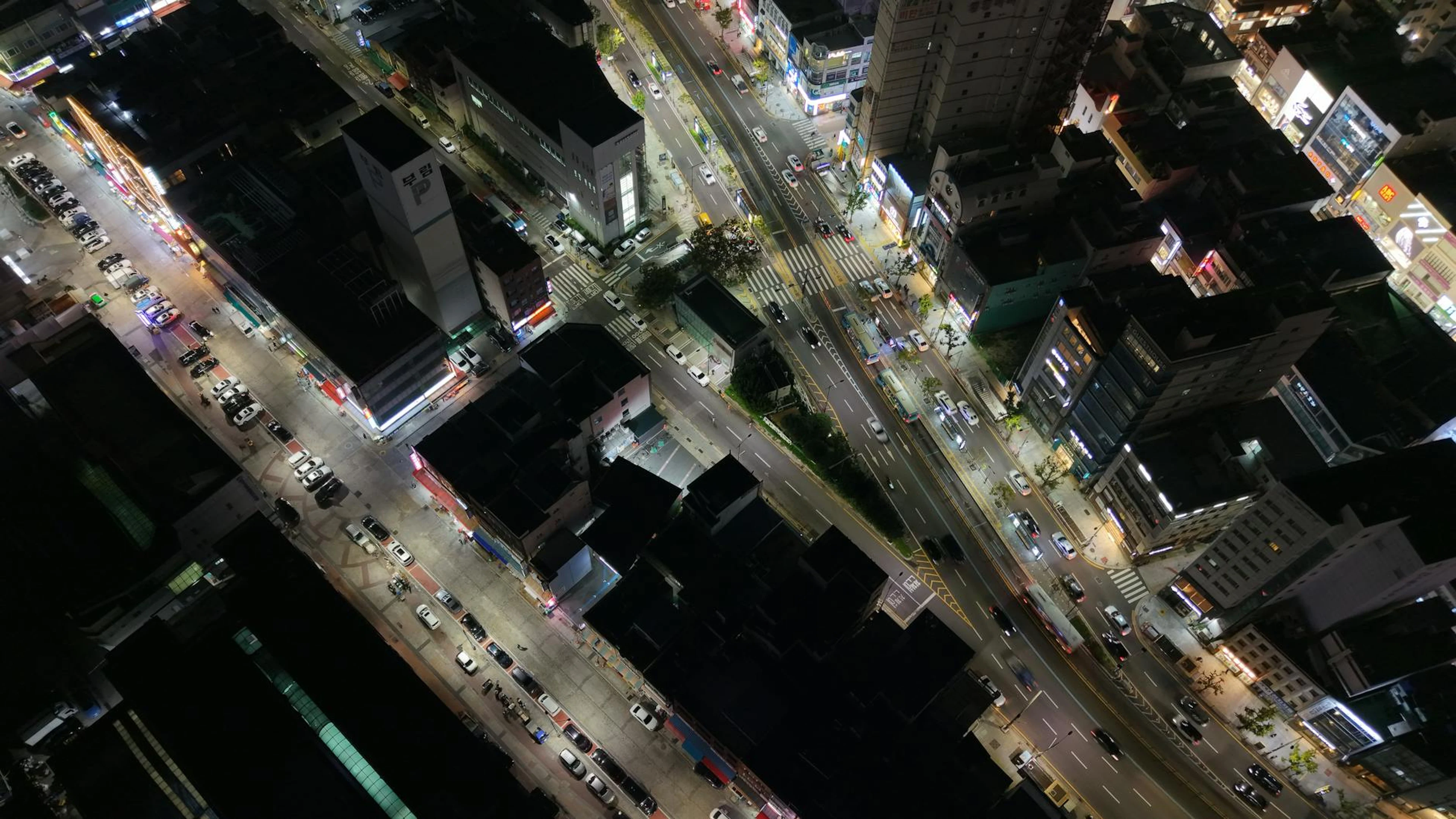 Free A dynamic aerial view of Busan's city streets at night, showcasing bustling urba wallpaper in 4K Ultra HD resolution (3840x2160). Beautiful city background for your screen. No signup required.