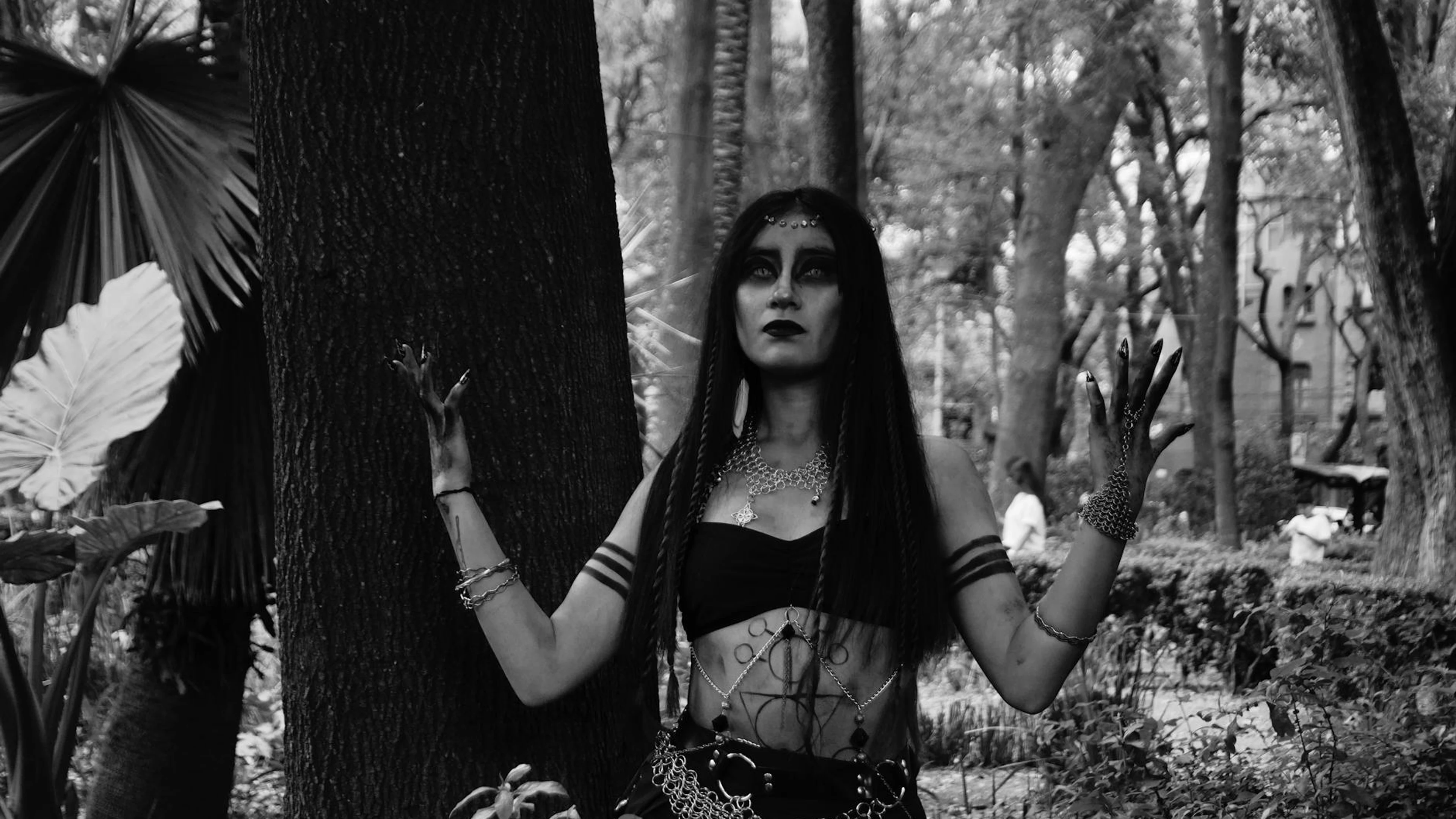 A gothic woman in a mystical forest, with dark makeup and jewelry, creates an ee