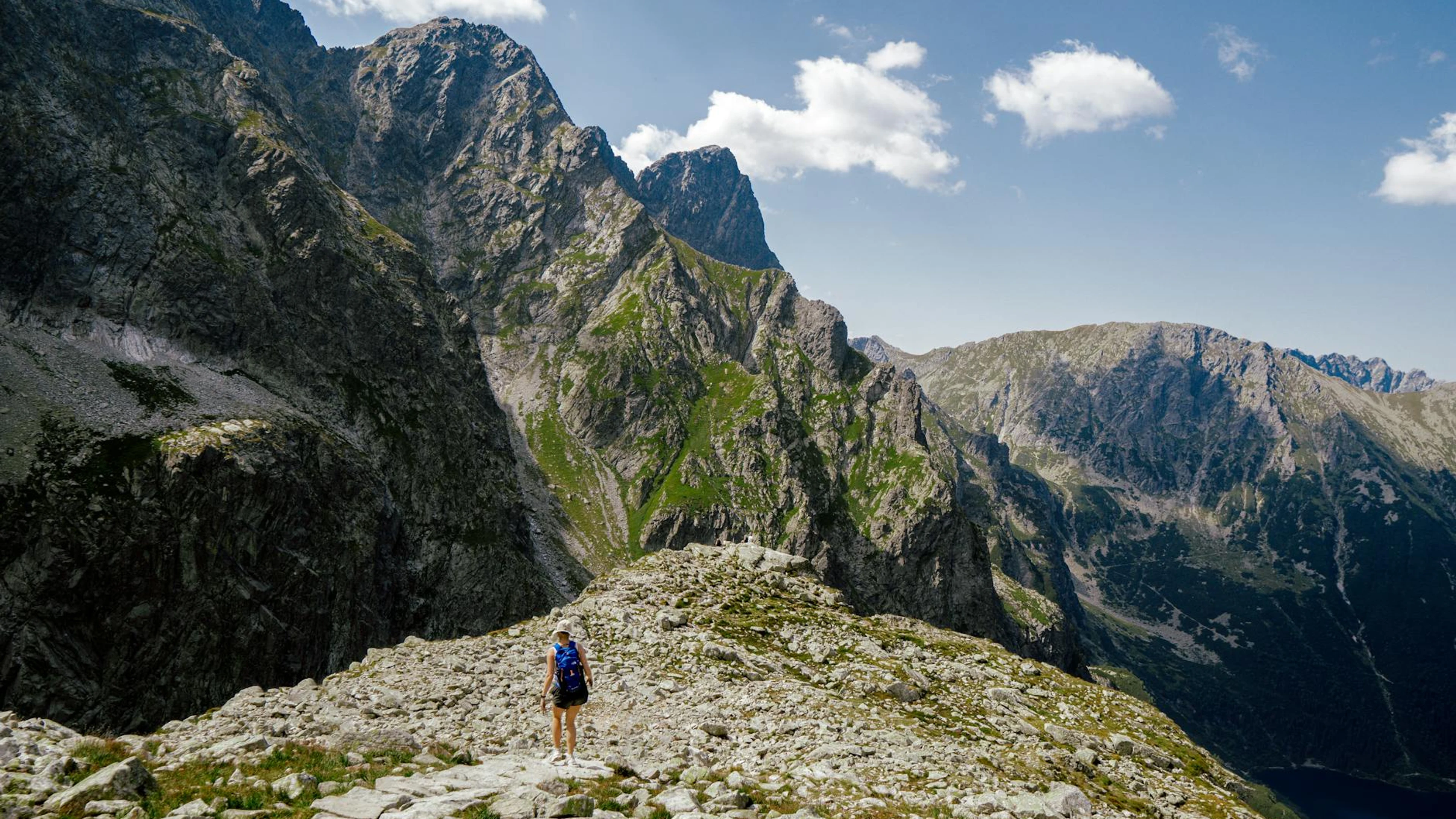 A hiker traverses the rugged terrain of the Tatra Mountains under a bright blue
