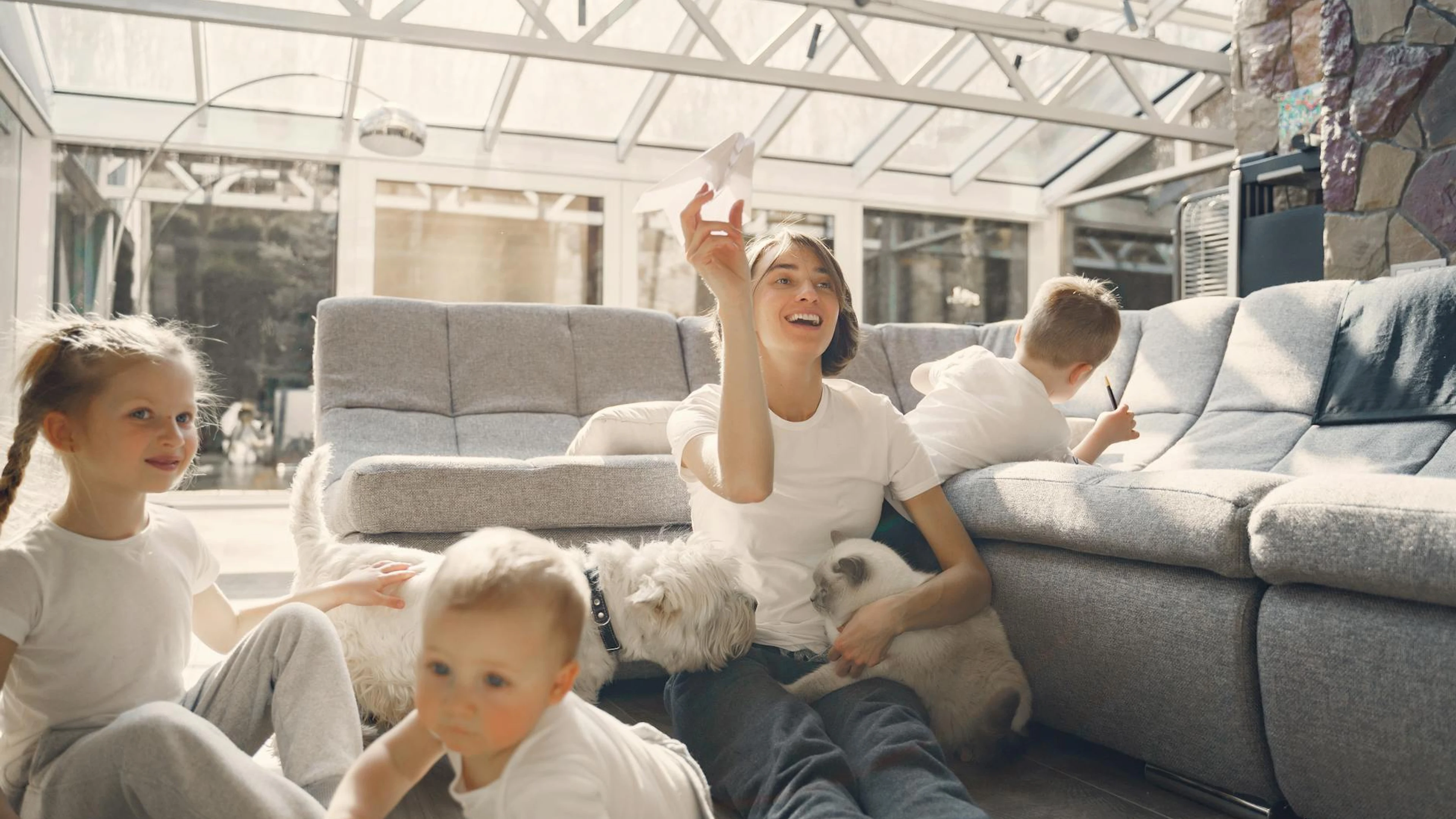 A joyful family with children and pets having fun indoors, enjoying leisure time