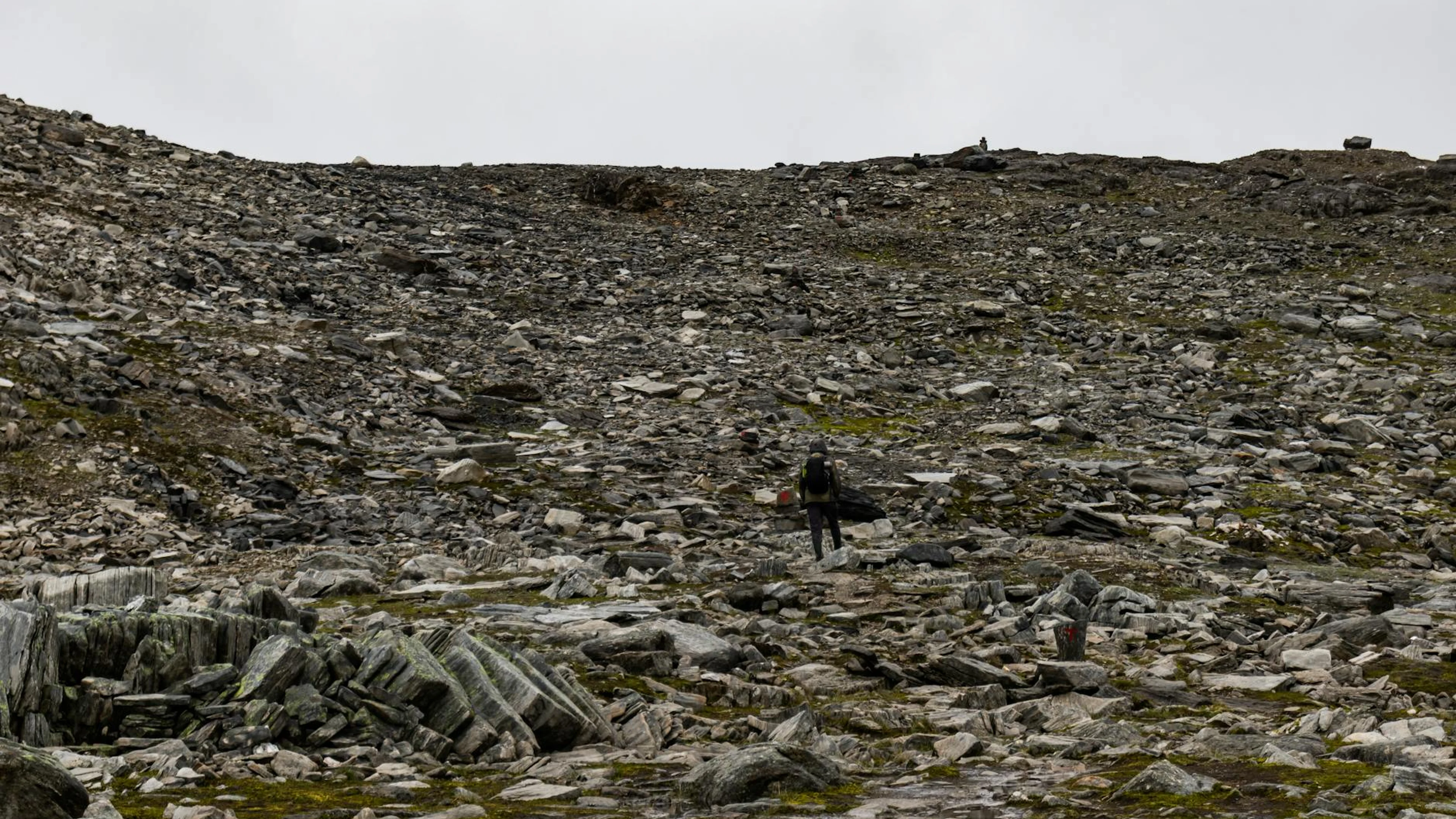 A lone person hikes across a desolate rocky landscape under a cloudy sky.