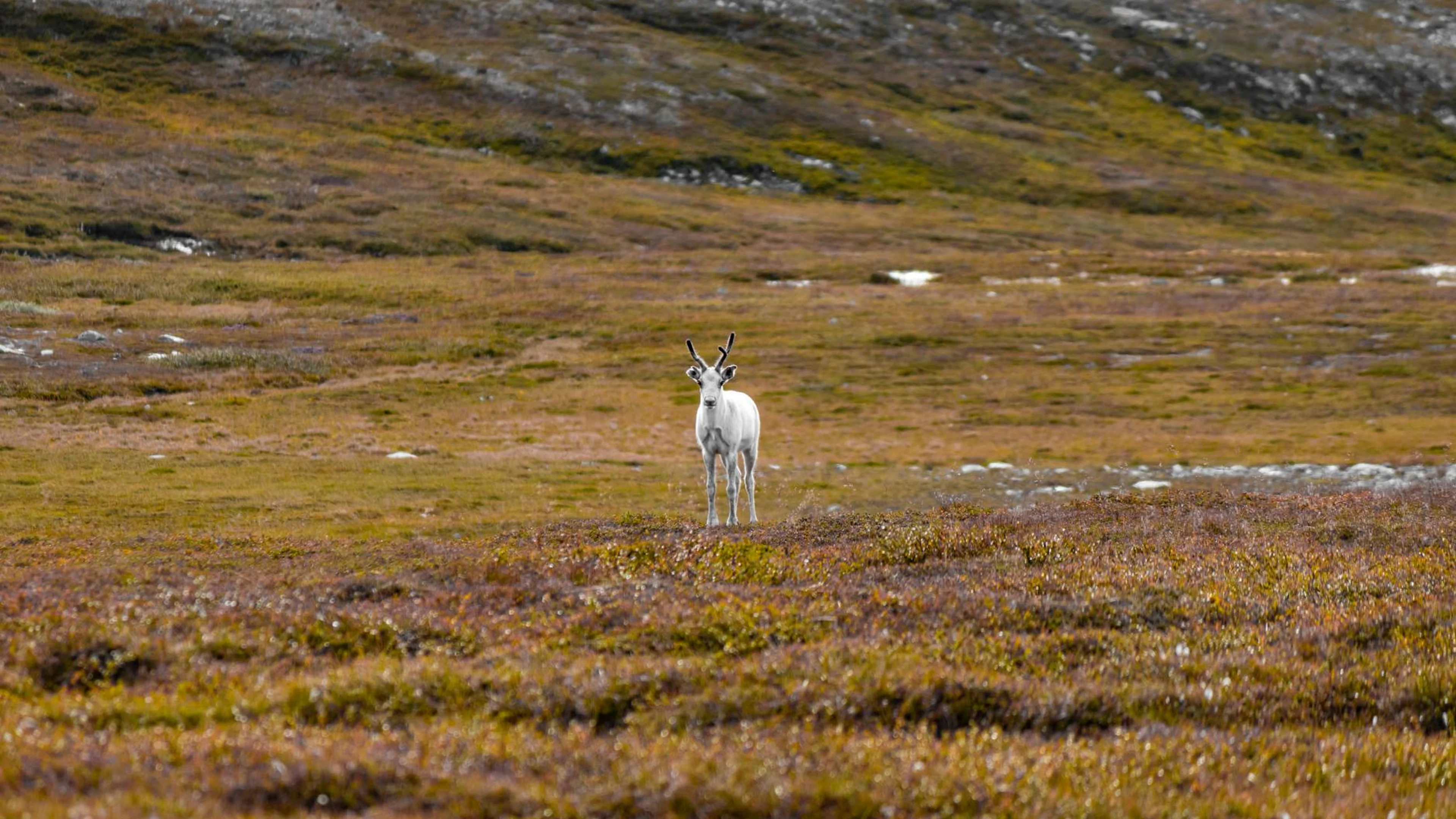 Download A lone reindeer in an autumn tundra landscape, showcasing nature's serene beauty wallpaper for free. 3840x2160 4K Ultra HD resolution, perfect for your desktop. High quality animals wallpaper.