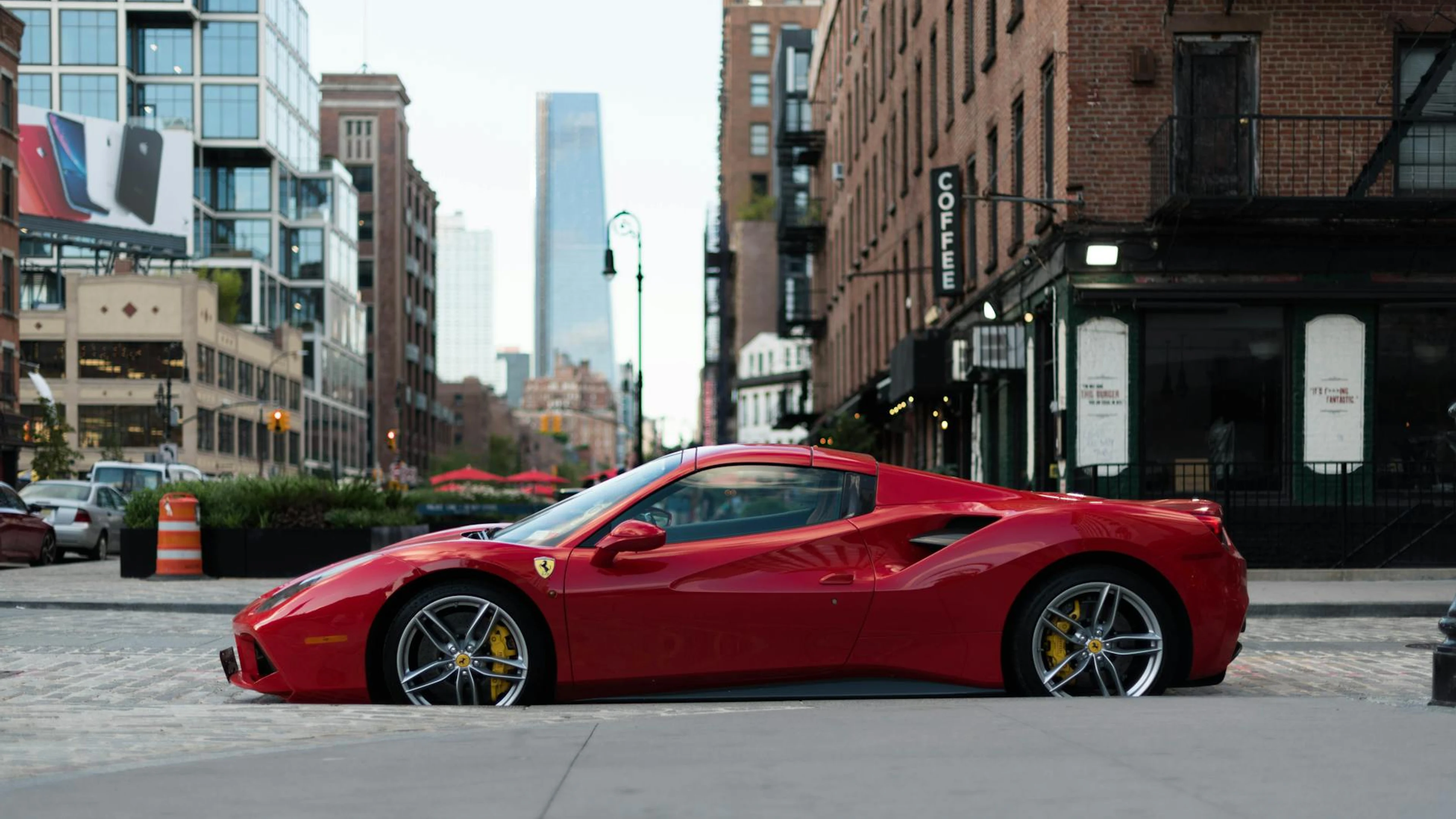 Free A luxurious red Ferrari sports car parked in urban New York City against a backd wallpaper in 4K Ultra HD resolution (3840x2160). Beautiful cars background for your screen. No signup required.