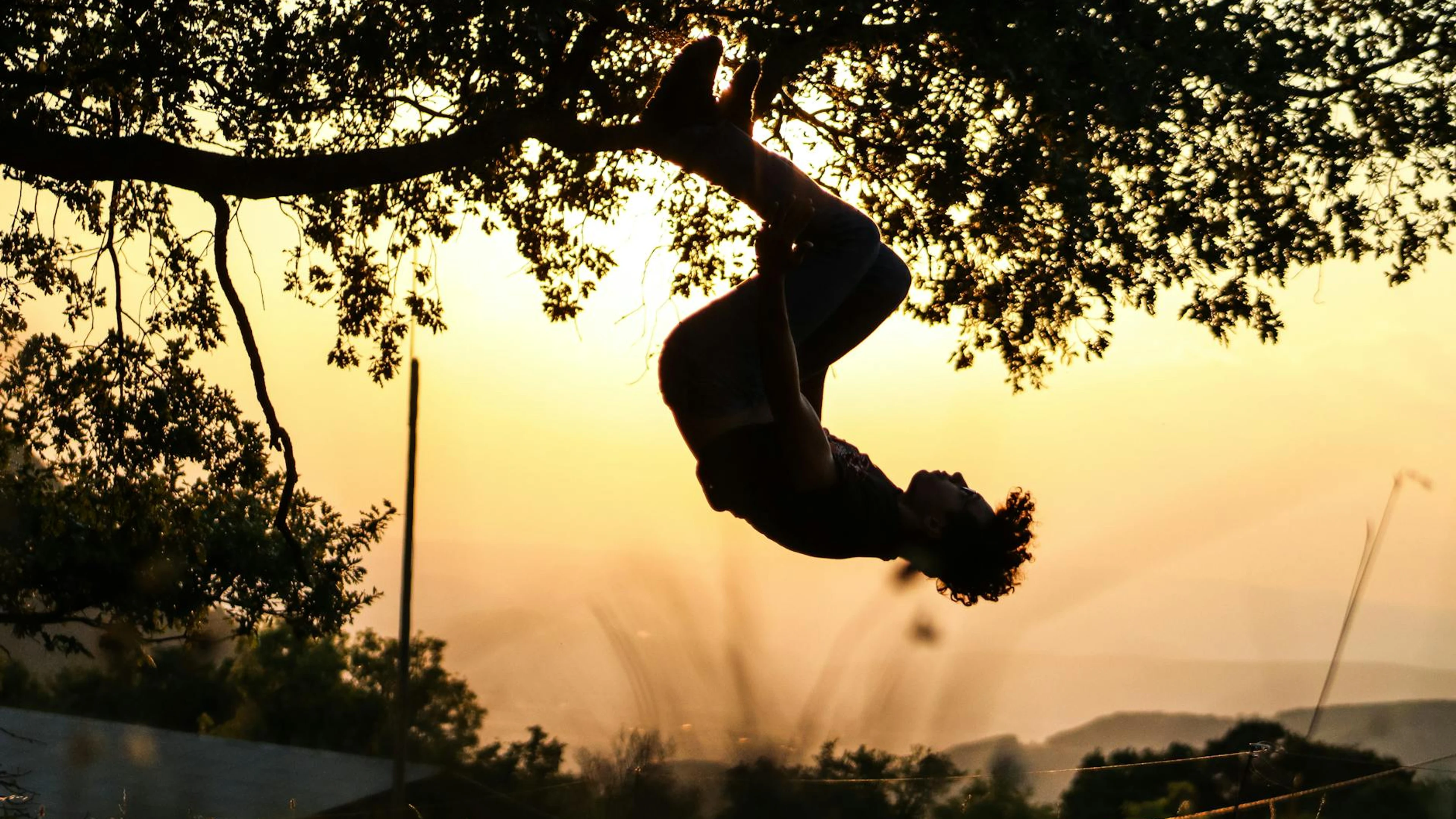 Get this stunning A man silhouetted against the sunset performs a back flip from a tree branch out wallpaper in 4K Ultra HD quality. 3840x2160 sunset wallpaper available for free download.