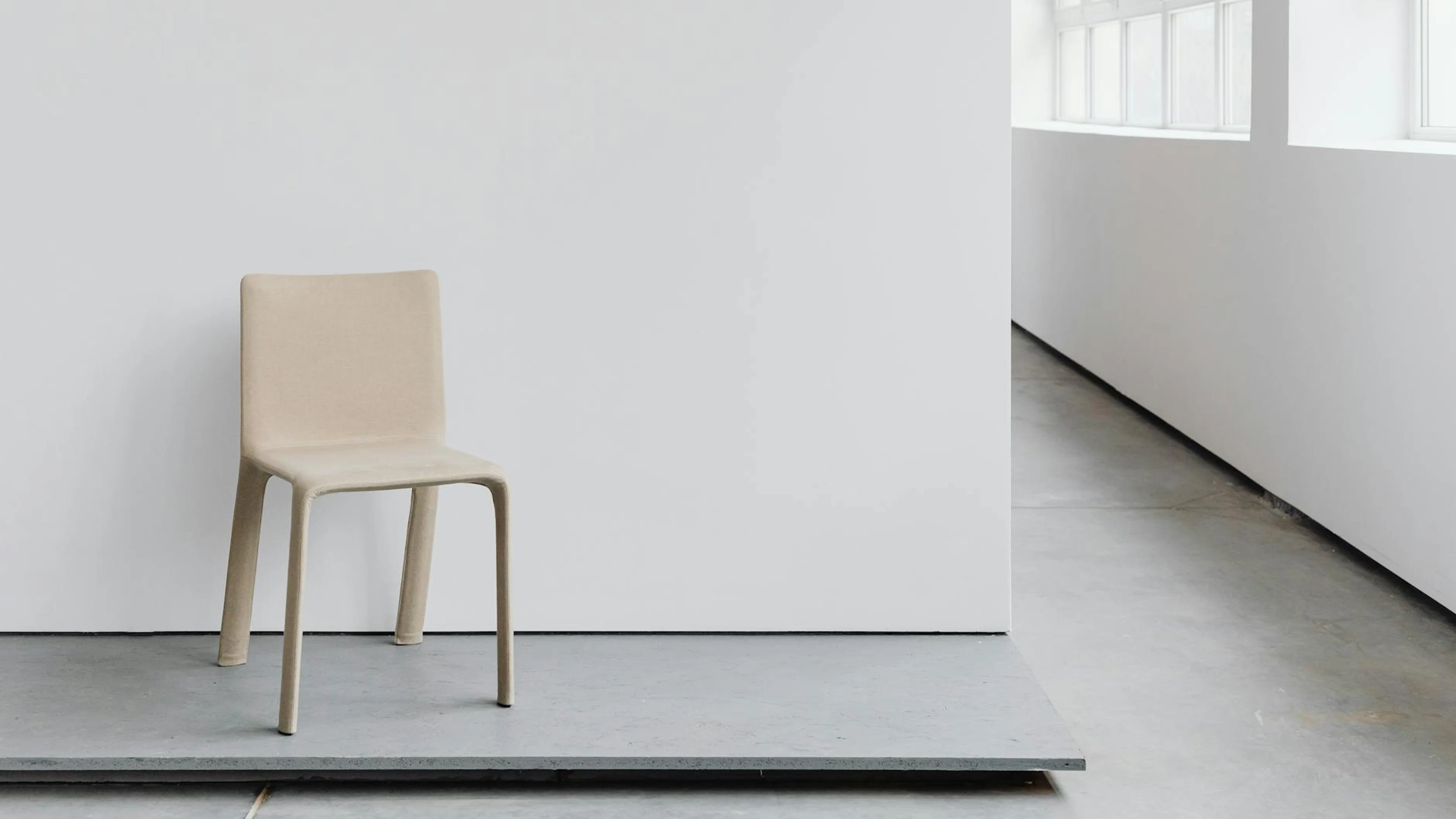 A minimalist beige chair placed in a modern, light-filled room with clean lines.