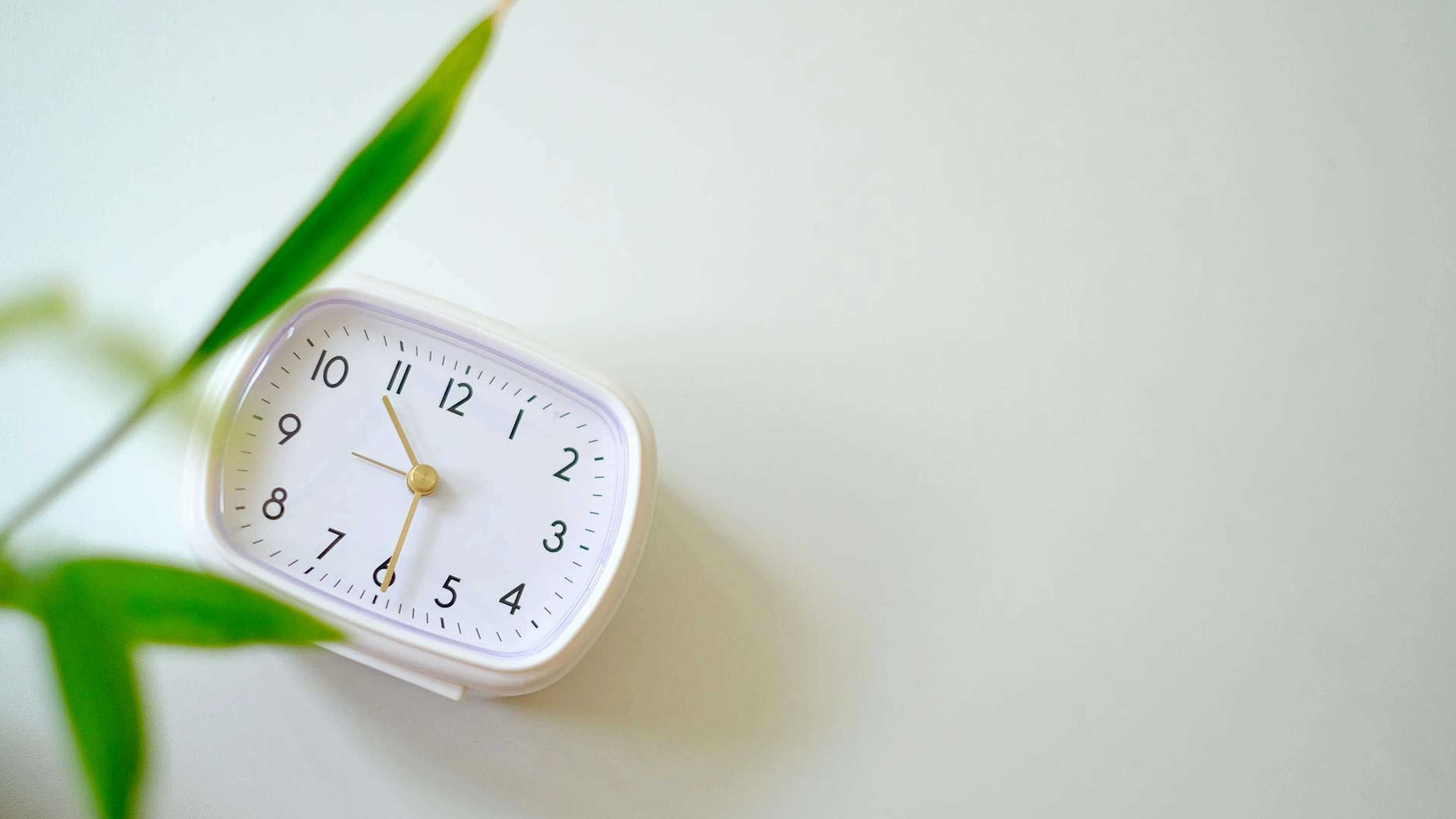 Free A minimalist white desk clock paired with a green leaf on a soft background. wallpaper in 4K Ultra HD resolution (3840x2160). Beautiful minimal background for your screen. No signup required.