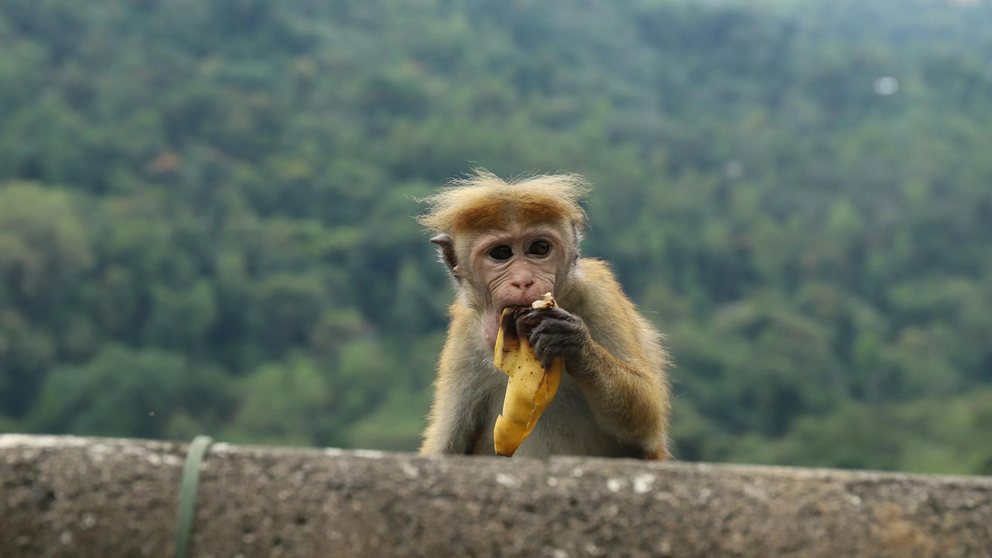 Get this stunning A monkey eating a banana on a stone wall with lush greenery as the backdrop. wallpaper in 4K Ultra HD quality. 3840x2160 animals wallpaper available for free download.