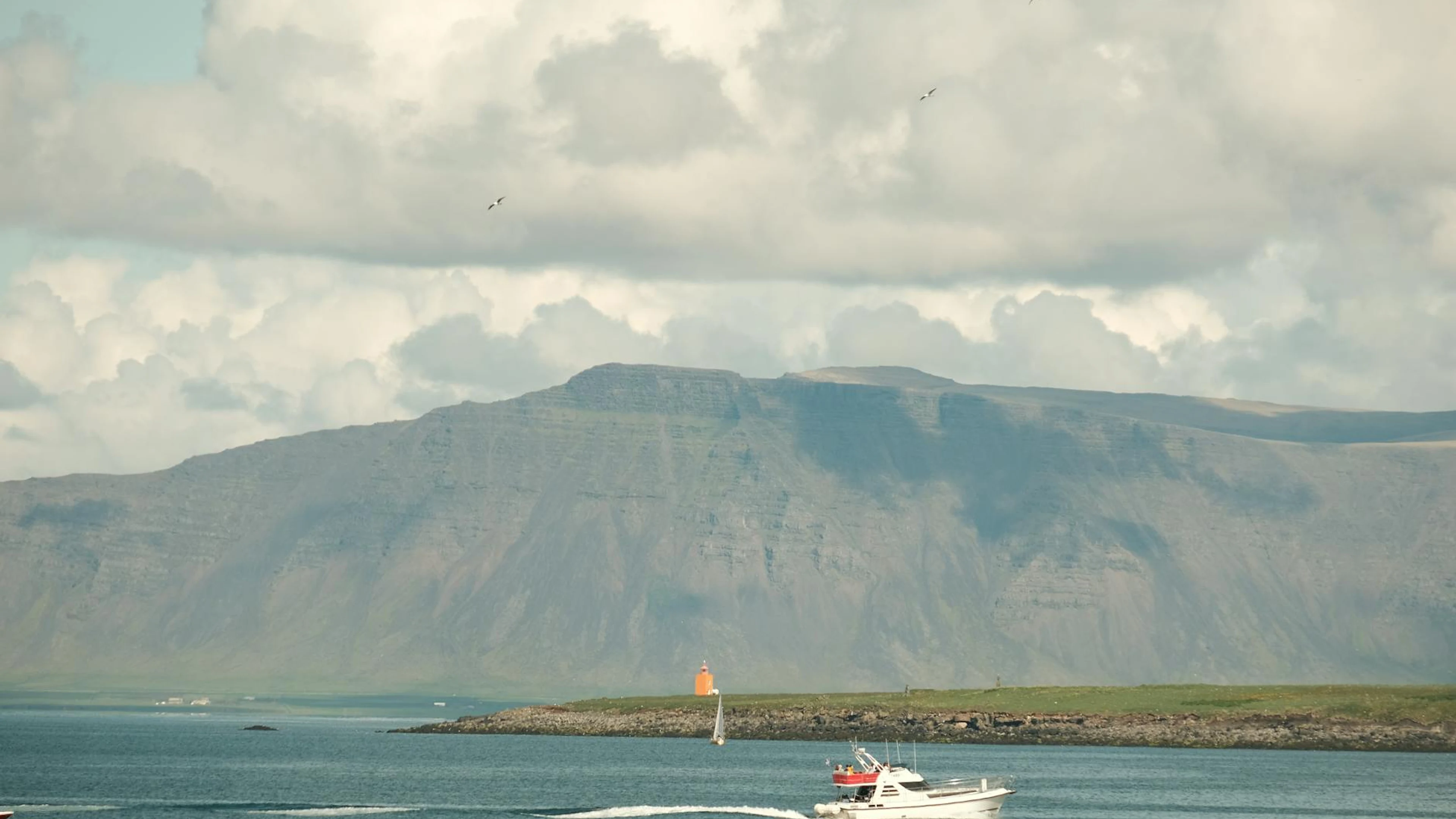A peaceful view of Reykjavík's coastline with a boat and distant mountains under