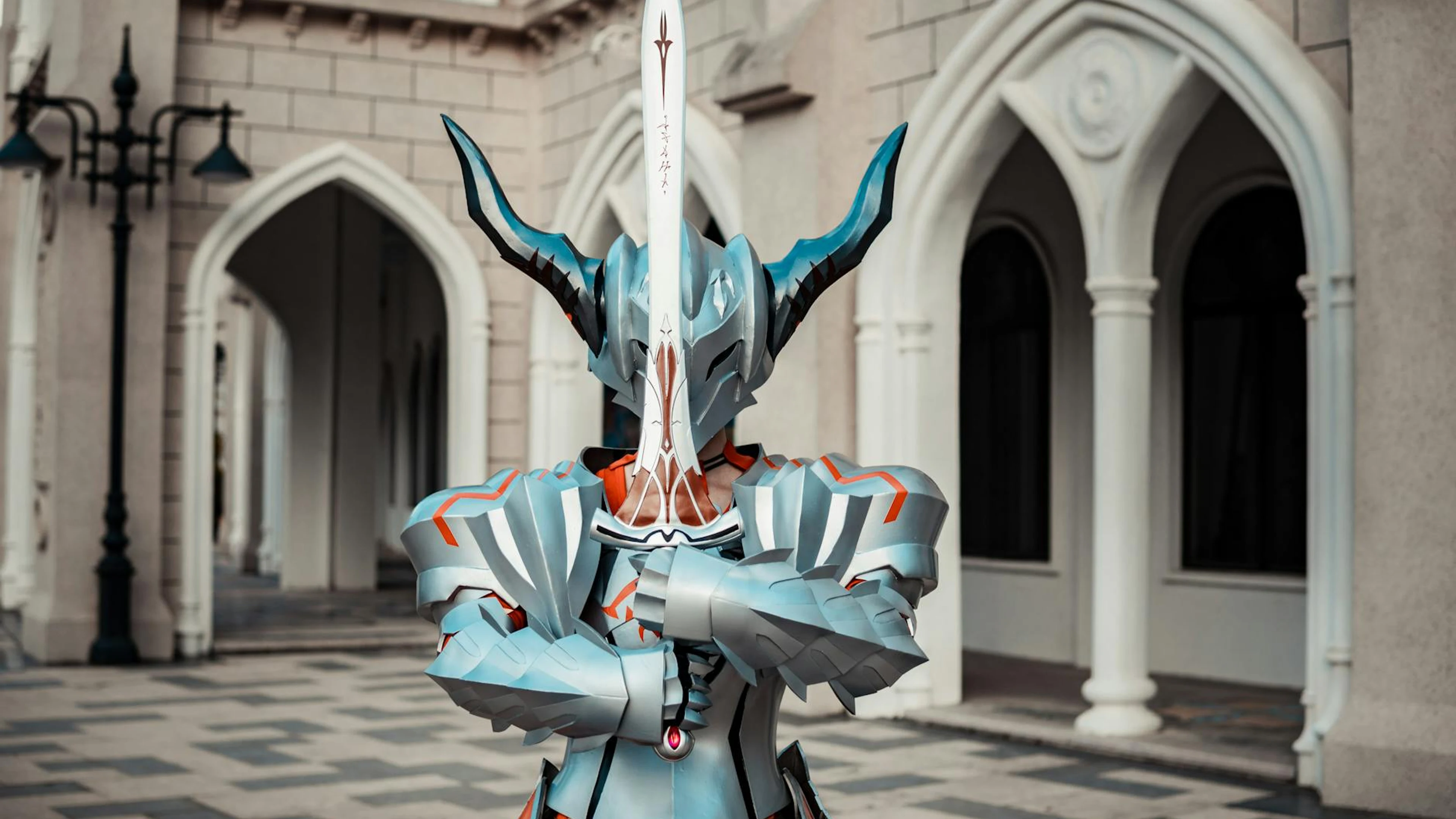 A person in detailed fantasy armor holding a sword in front of an architectural