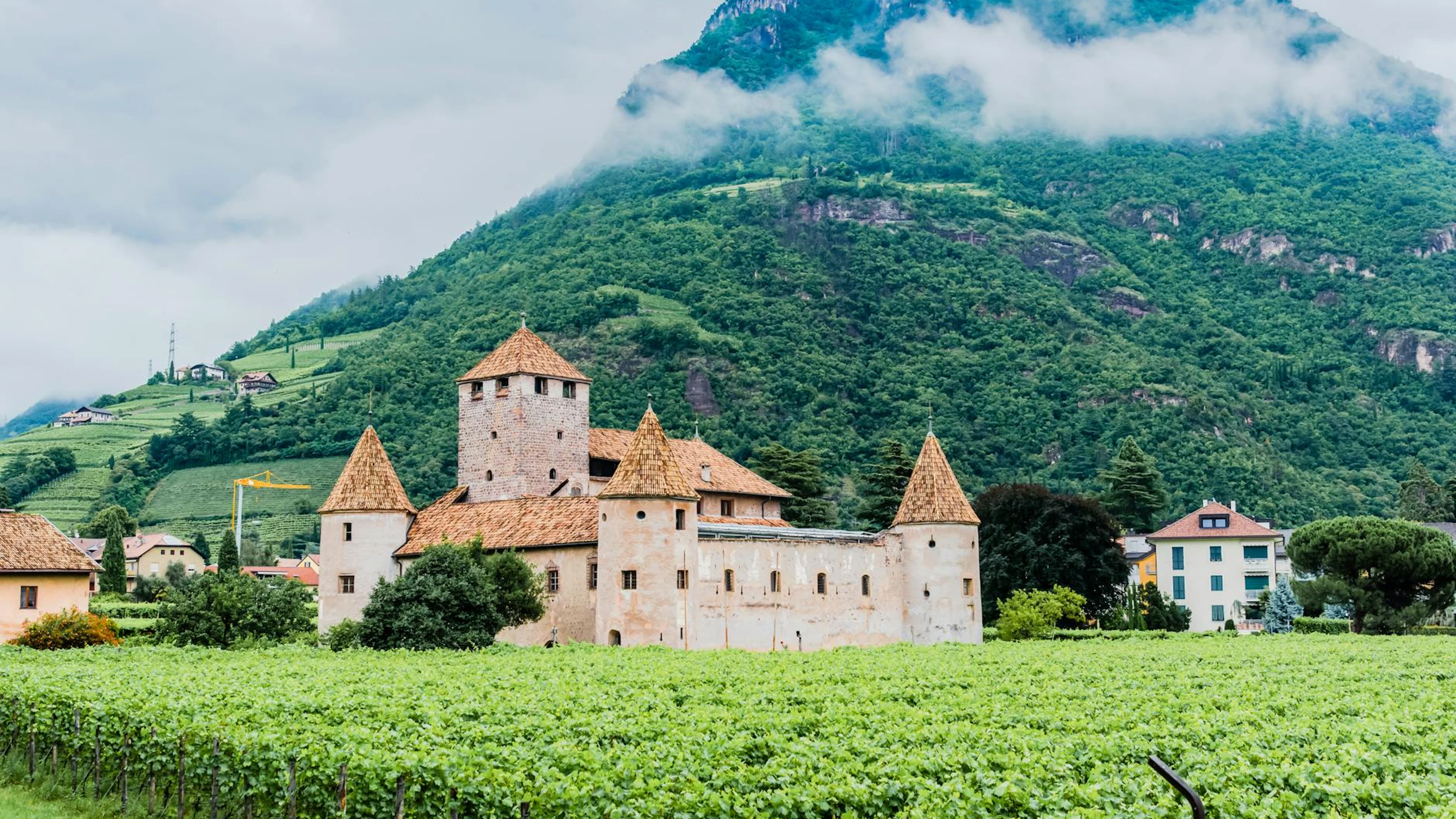 A picturesque castle surrounded by lush greenery and mountains in Trentino-South