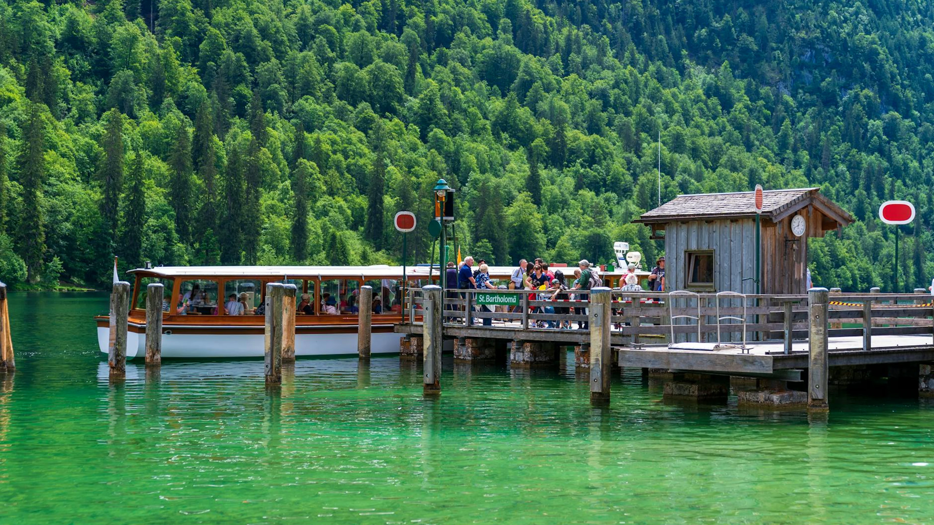 A picturesque view of Lake Königssee, featuring a boat docked by a wooden pier s