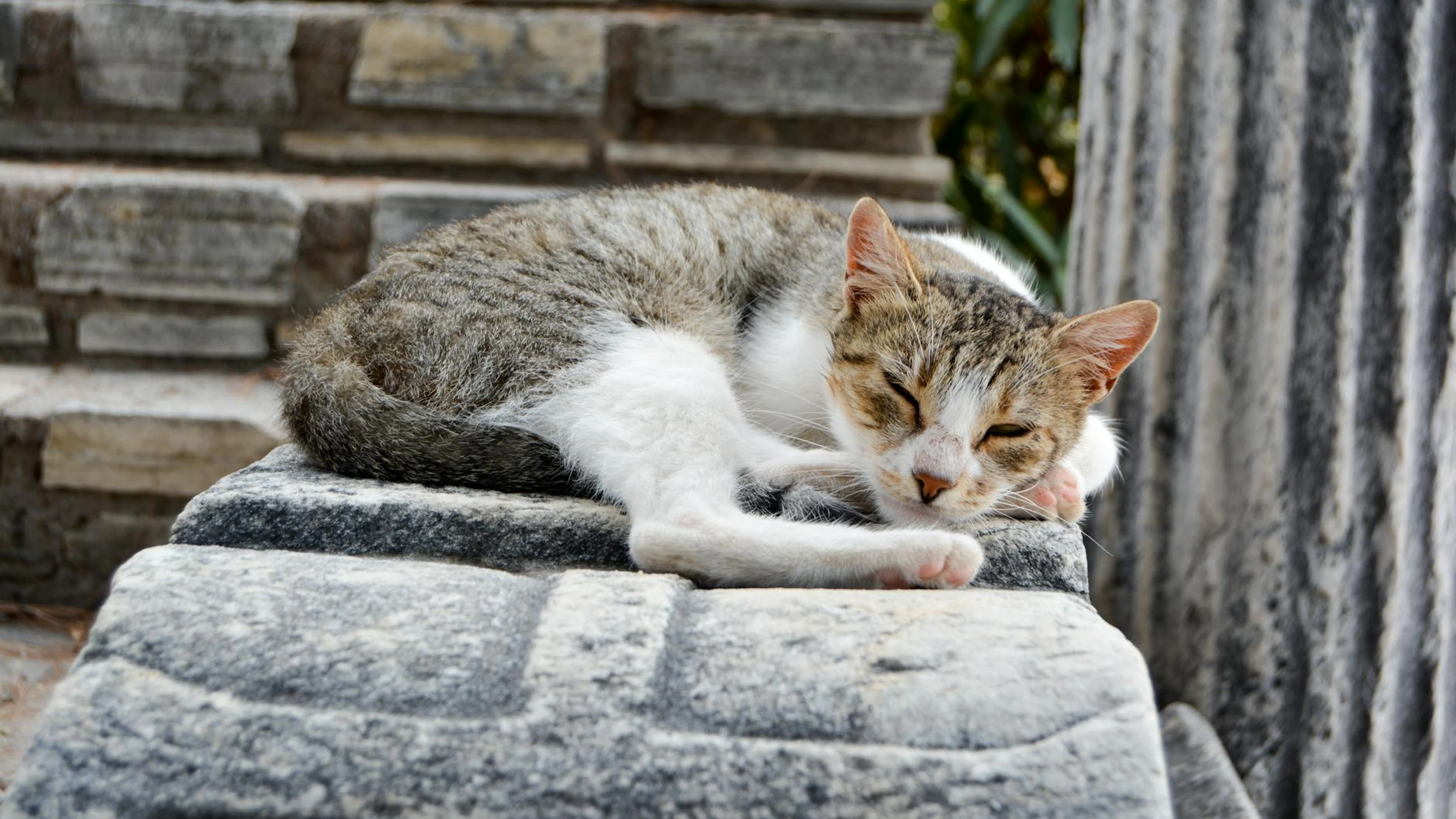 A relaxed cat sleeping on a stone surface in İzmir, Türkiye, creating a serene s