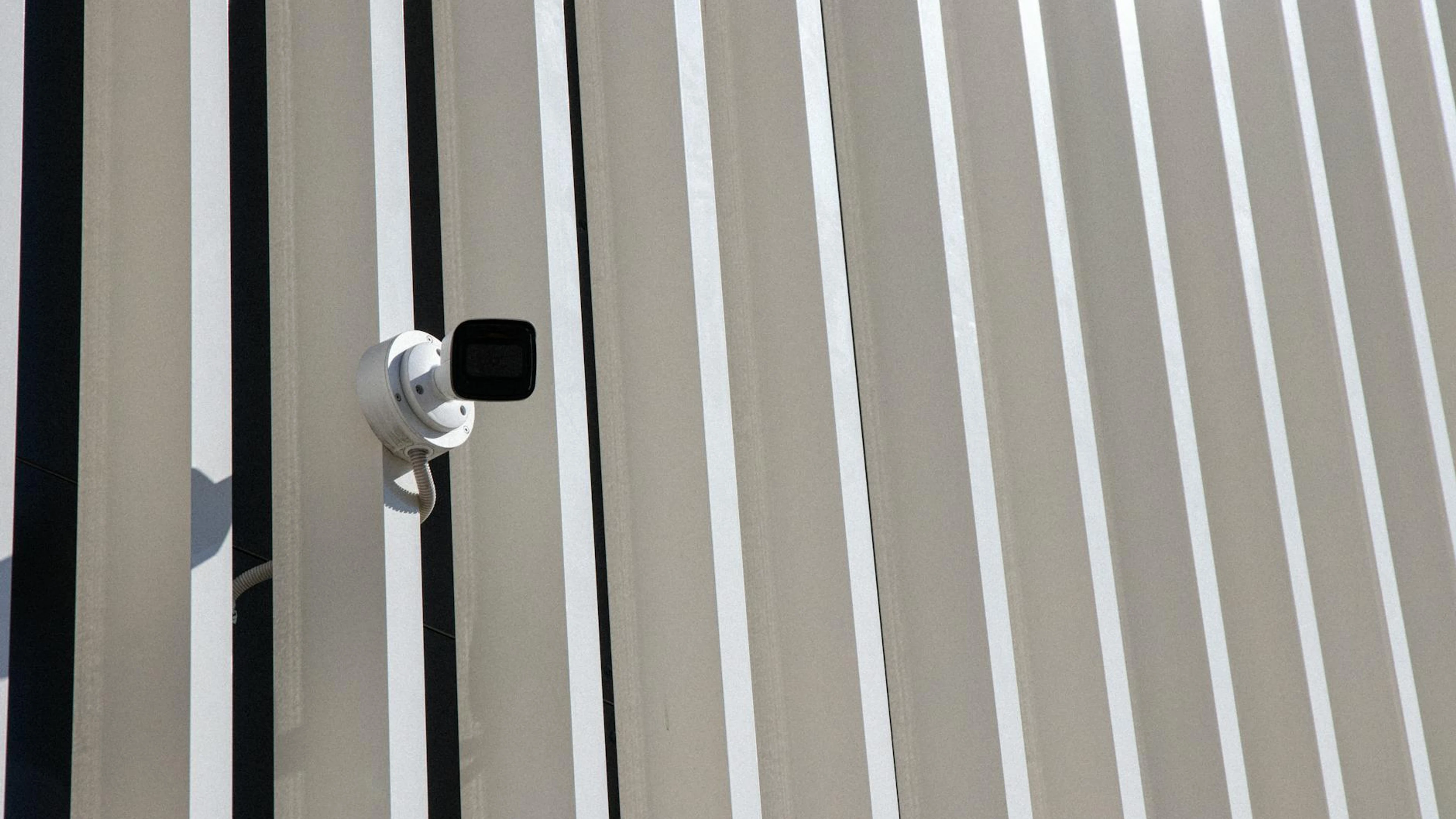 Download A security camera is mounted on a building with sleek, vertical lines creating a wallpaper for free. 3840x2160 4K Ultra HD resolution, perfect for your desktop. High quality minimal wallpaper.