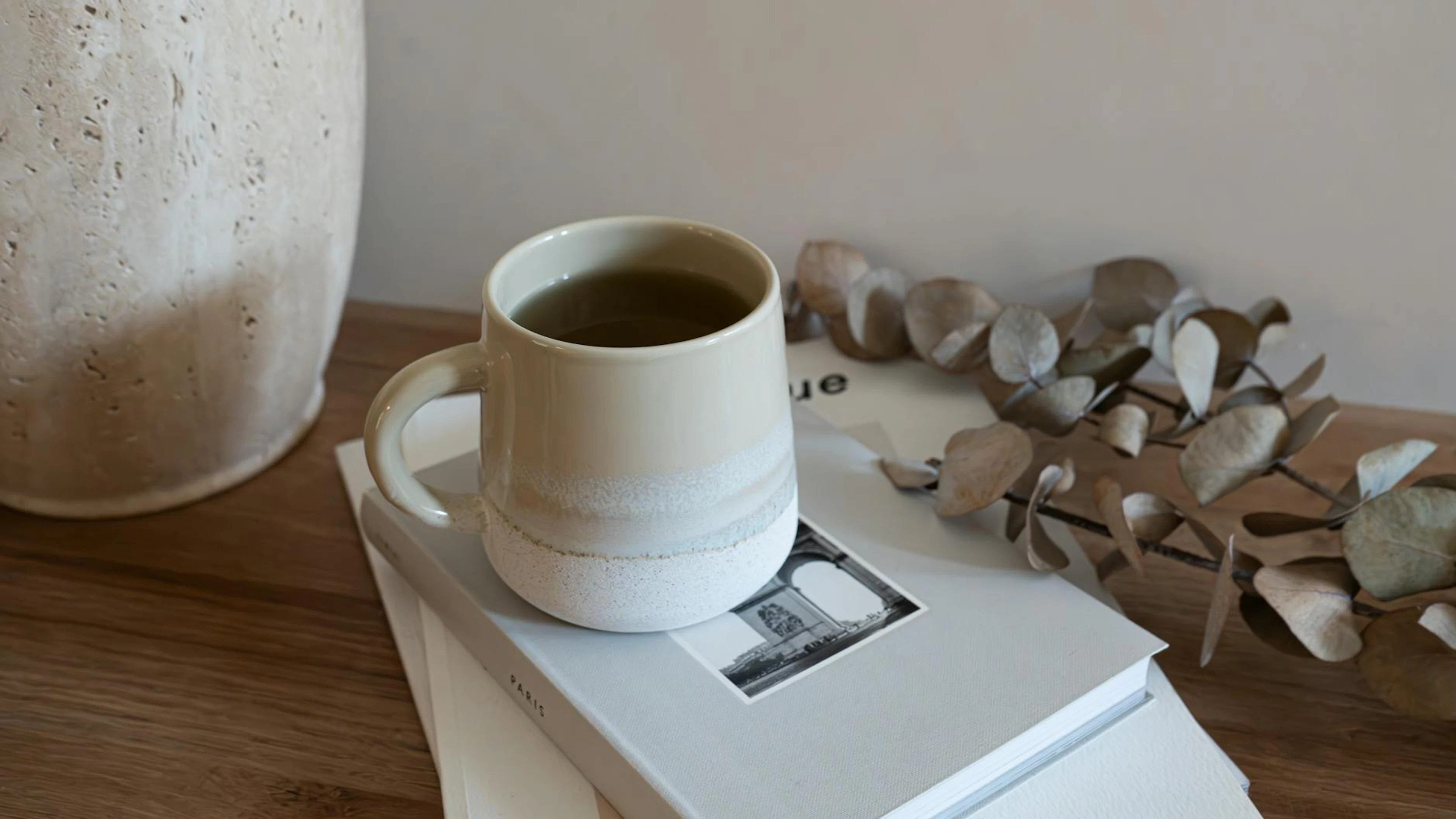 A serene still life featuring a ceramic mug of tea, dried eucalyptus, and books