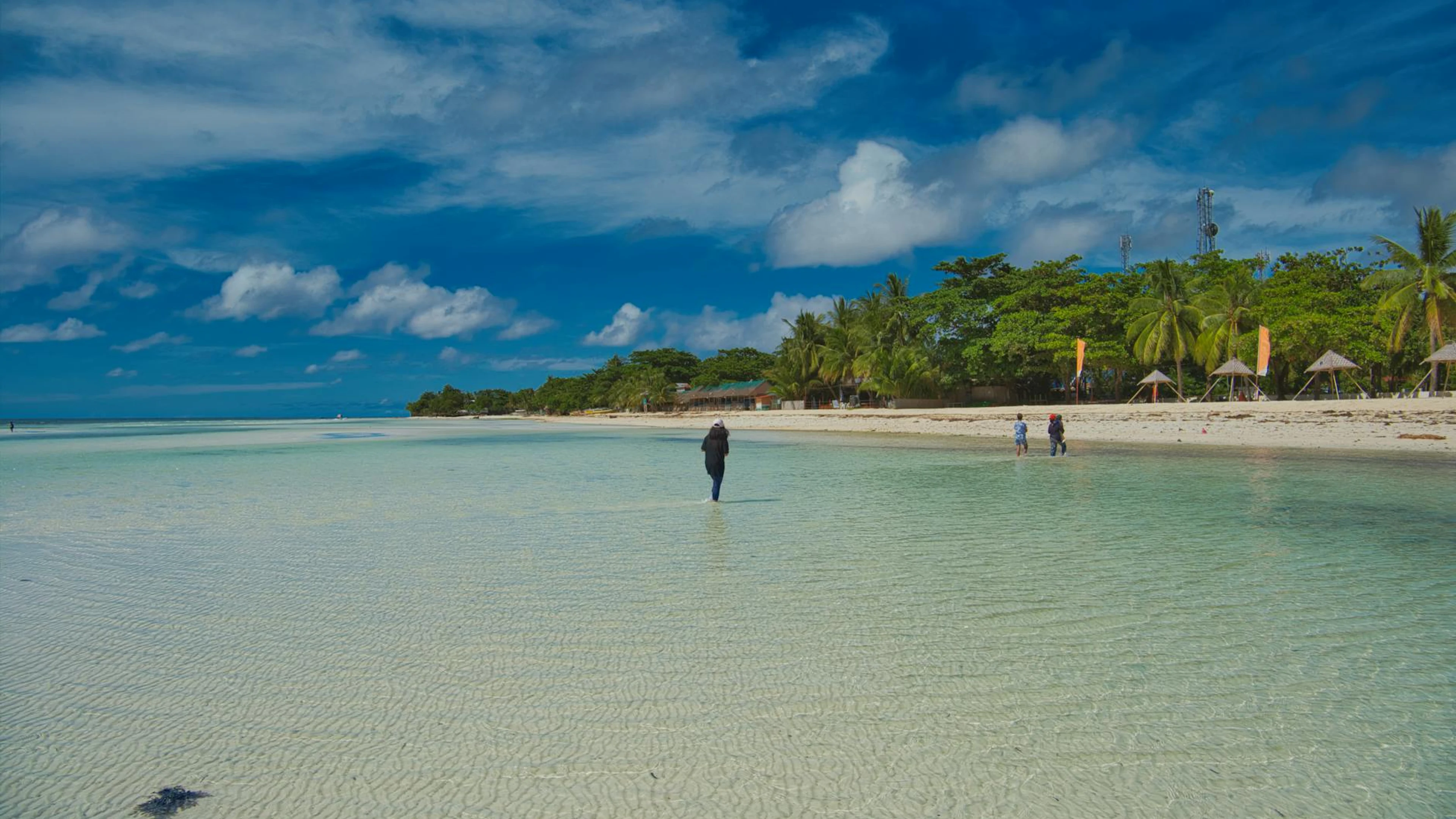 Get this stunning A serene tropical beach scene with clear water, palm trees, and people enjoying wallpaper in 4K Ultra HD quality. 3840x2160 ocean wallpaper available for free download.