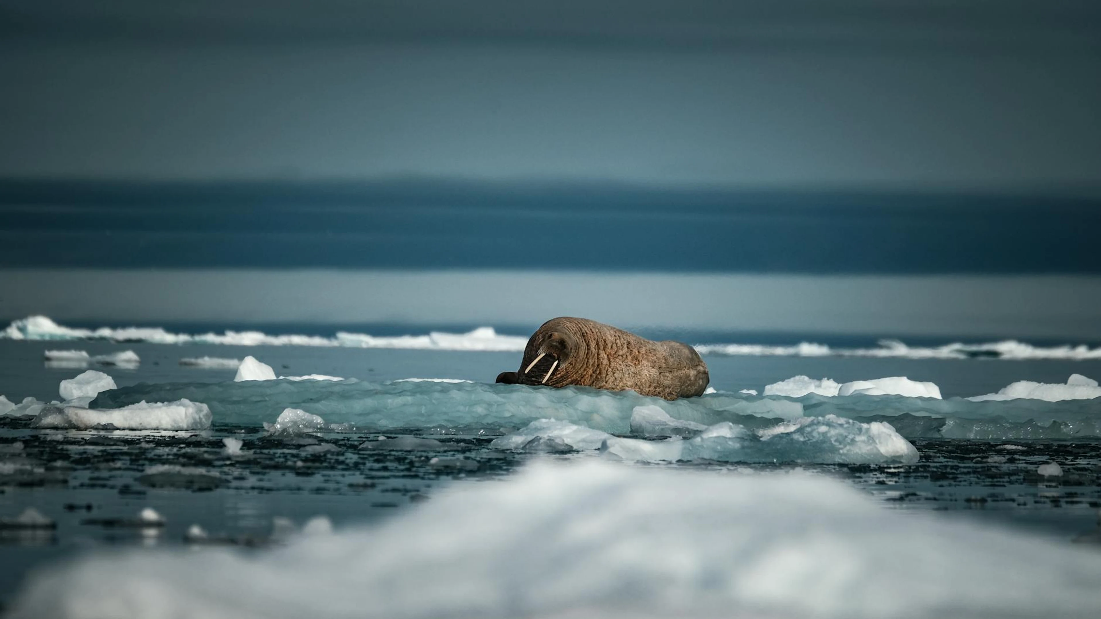 A solitary walrus lies on a floating iceberg in the Arctic ocean, showcasing the