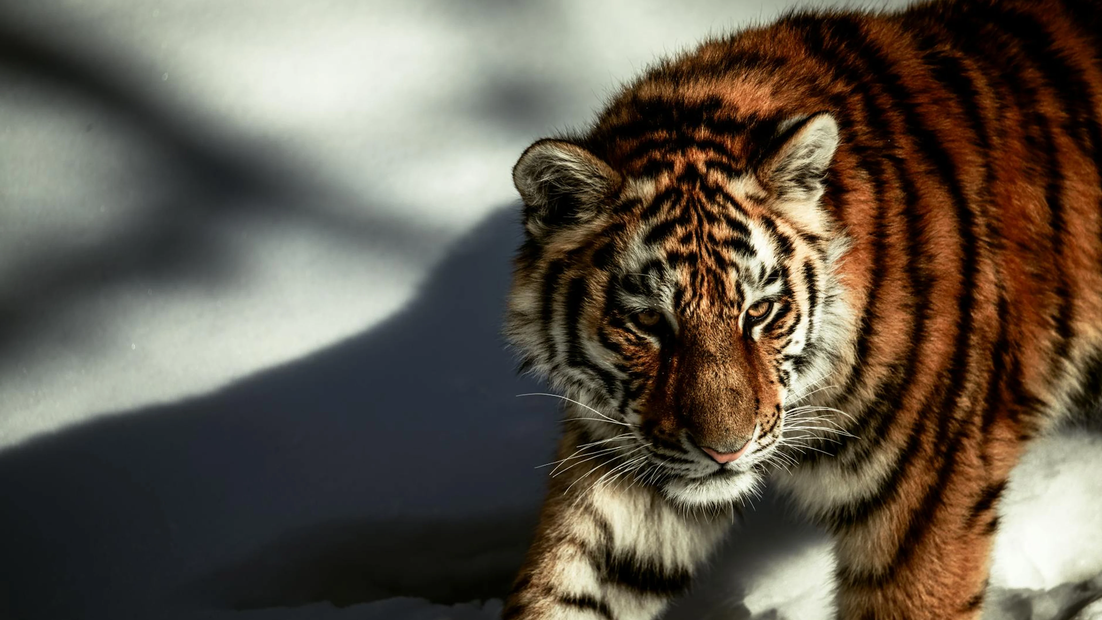 Download A stunning photograph of a tiger gracefully strolling through a snowy landscape, wallpaper for free. 3840x2160 4K Ultra HD resolution, perfect for your desktop. High quality anime wallpaper.