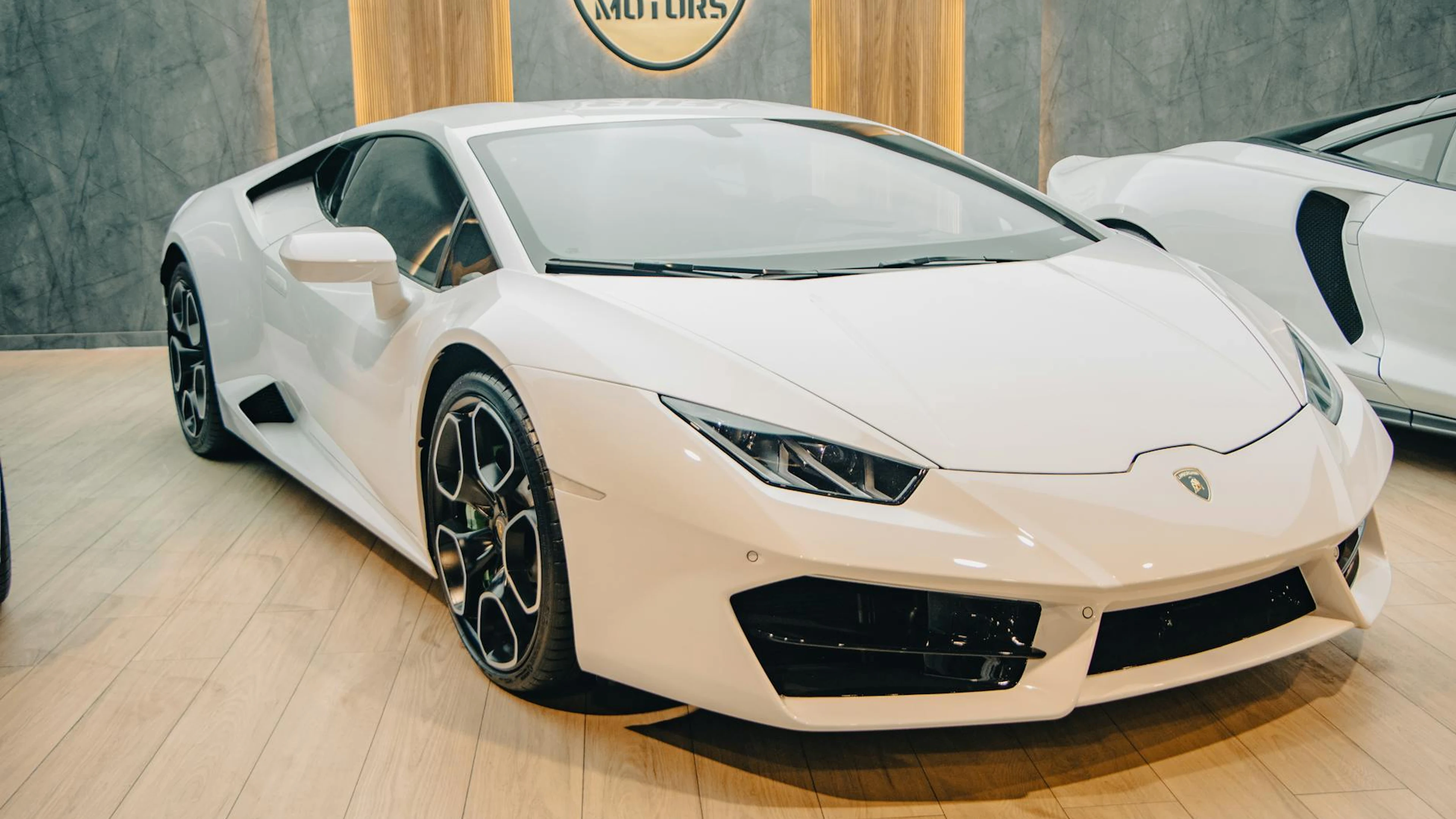 A stunning white Lamborghini sports car displayed in a high-end automobile showr