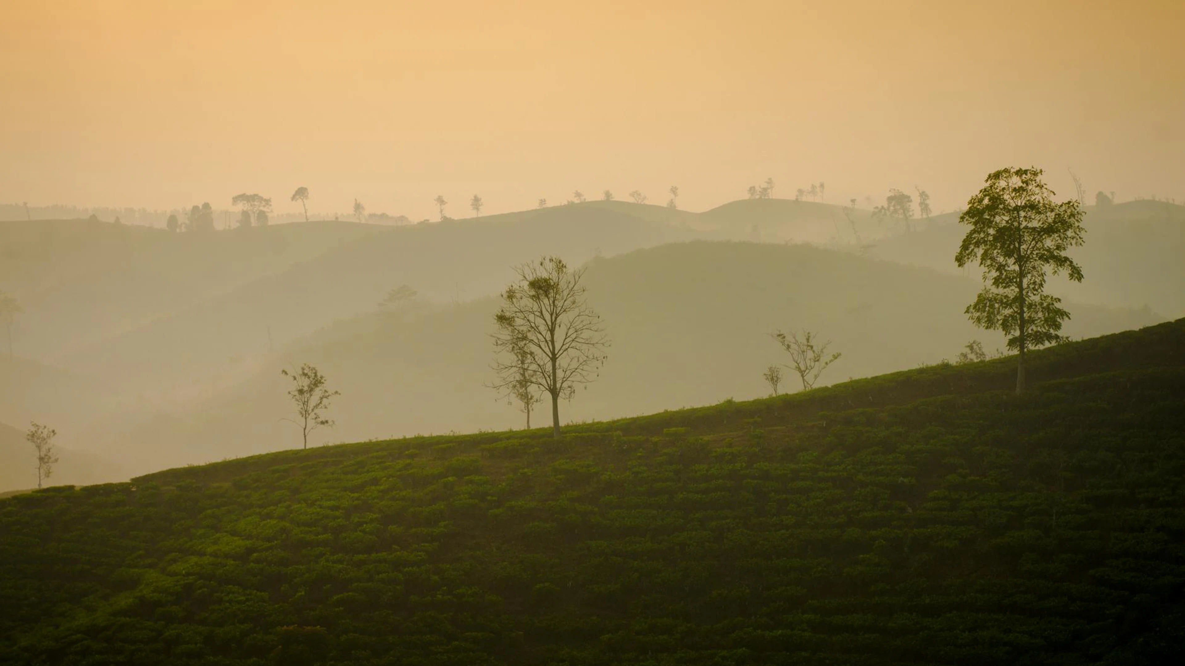 Get this stunning A tranquil landscape of rolling hills with trees during an orange sunset. wallpaper in 4K Ultra HD quality. 3840x2160 nature wallpaper available for free download.