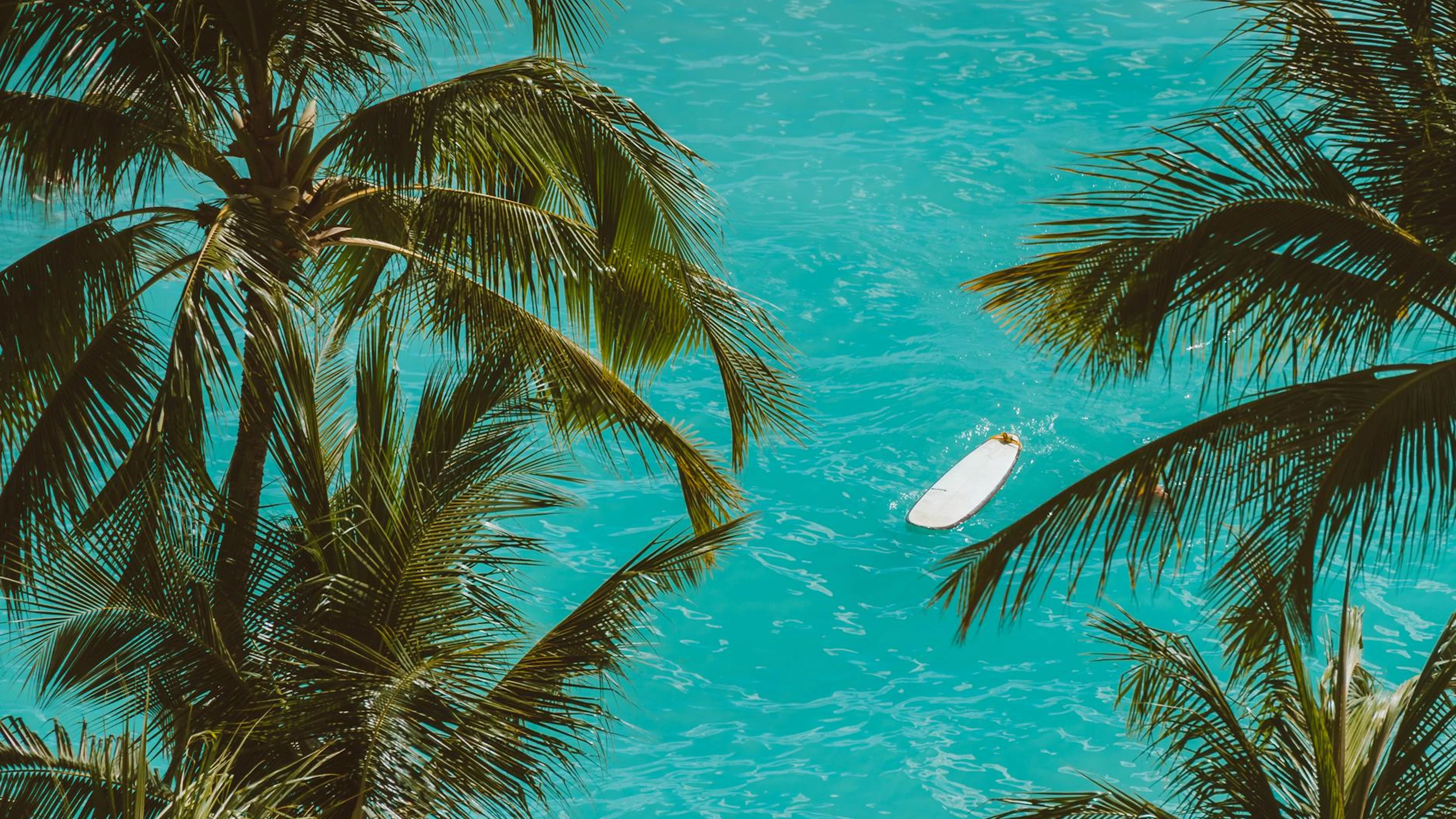Download A tranquil view of a surfboard on turquoise water encircled by palm trees. wallpaper for free. 3840x2160 4K Ultra HD resolution, perfect for your desktop. High quality ocean wallpaper.