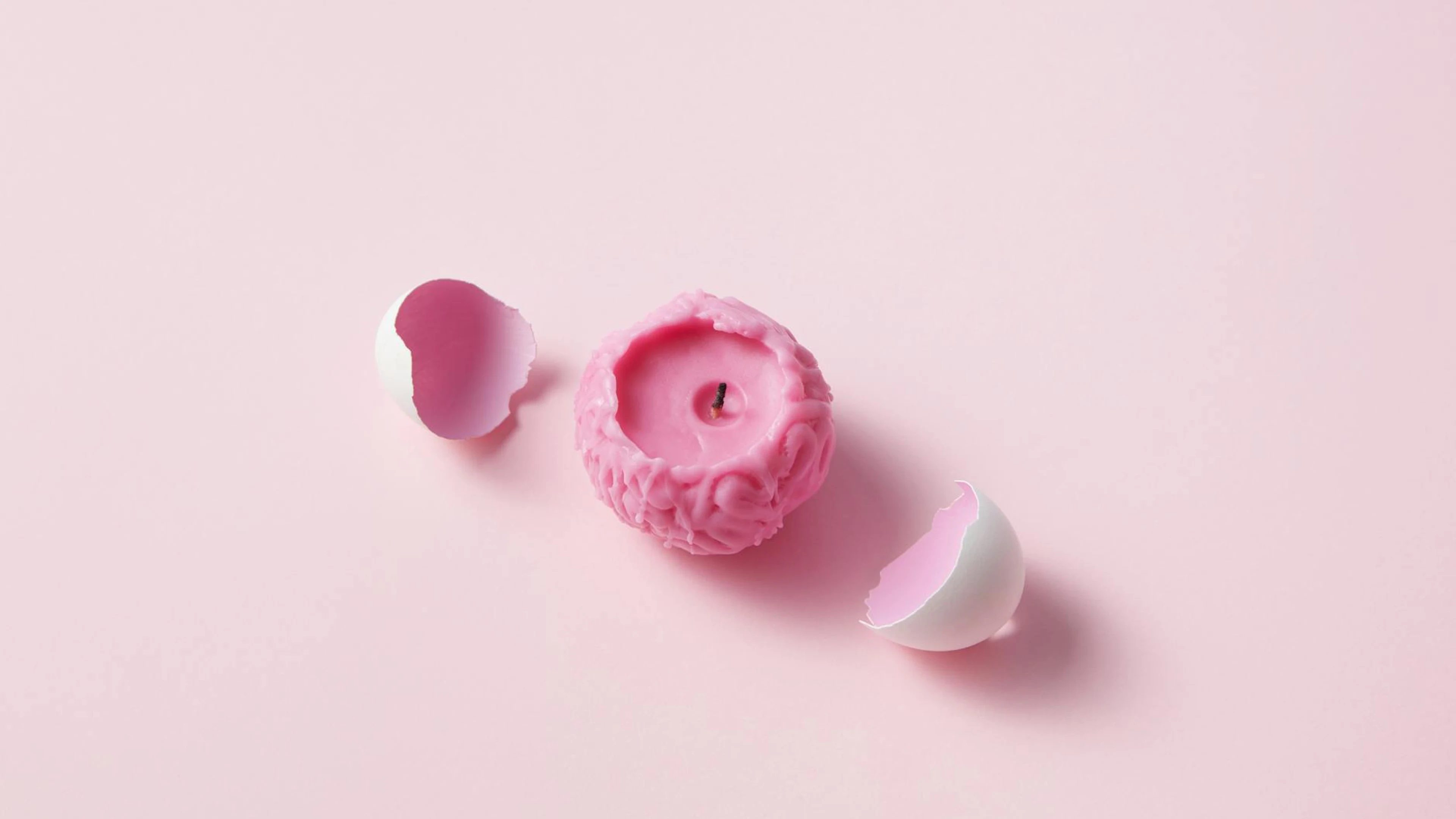 Free A unique pink candle shaped like a brain surrounded by white eggshells on a ligh wallpaper in 4K Ultra HD resolution (3840x2160). Beautiful minimal background for your screen. No signup required.