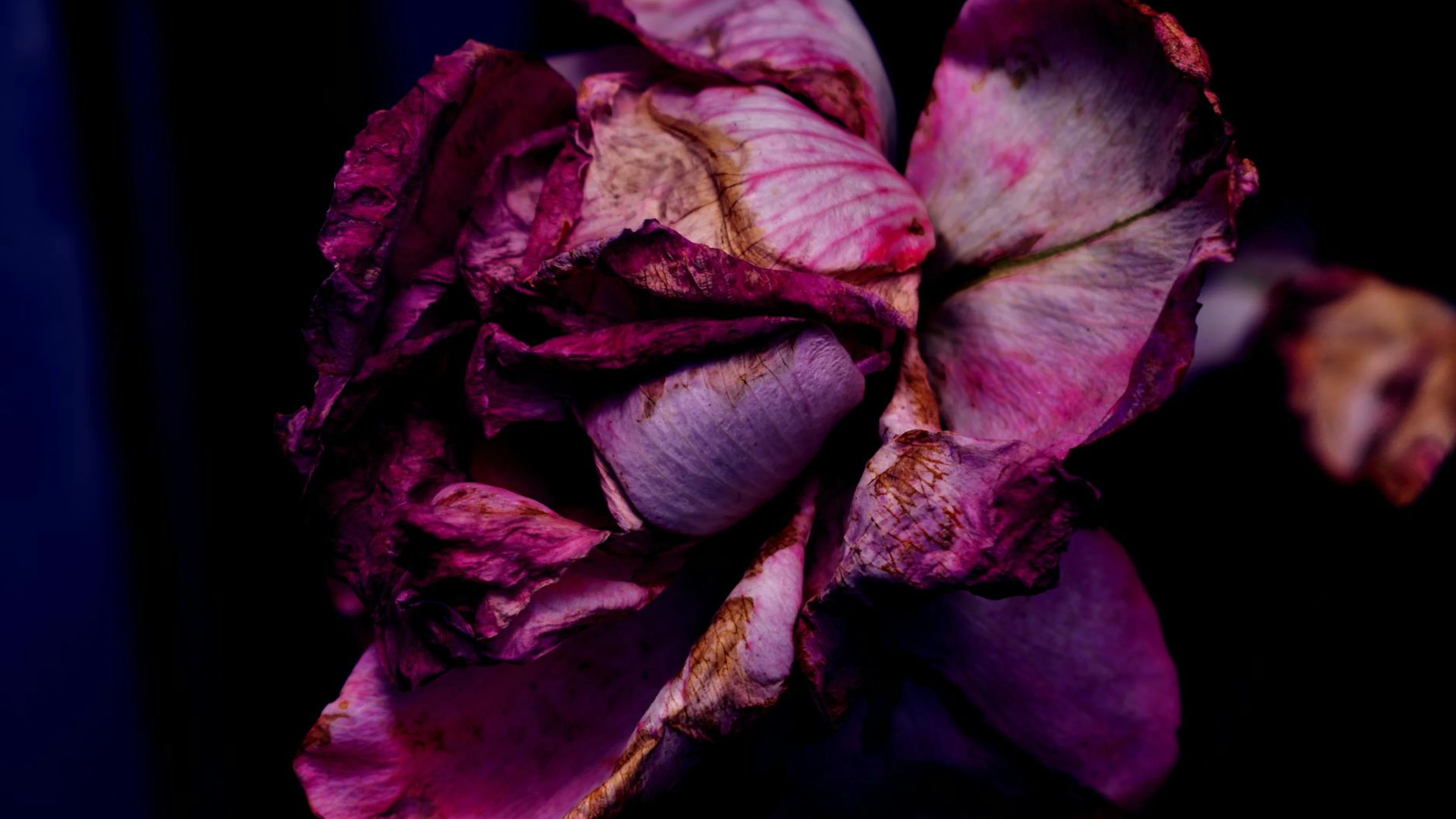 A vibrant close-up of a dried pink rose showcasing detailed textures with a dark