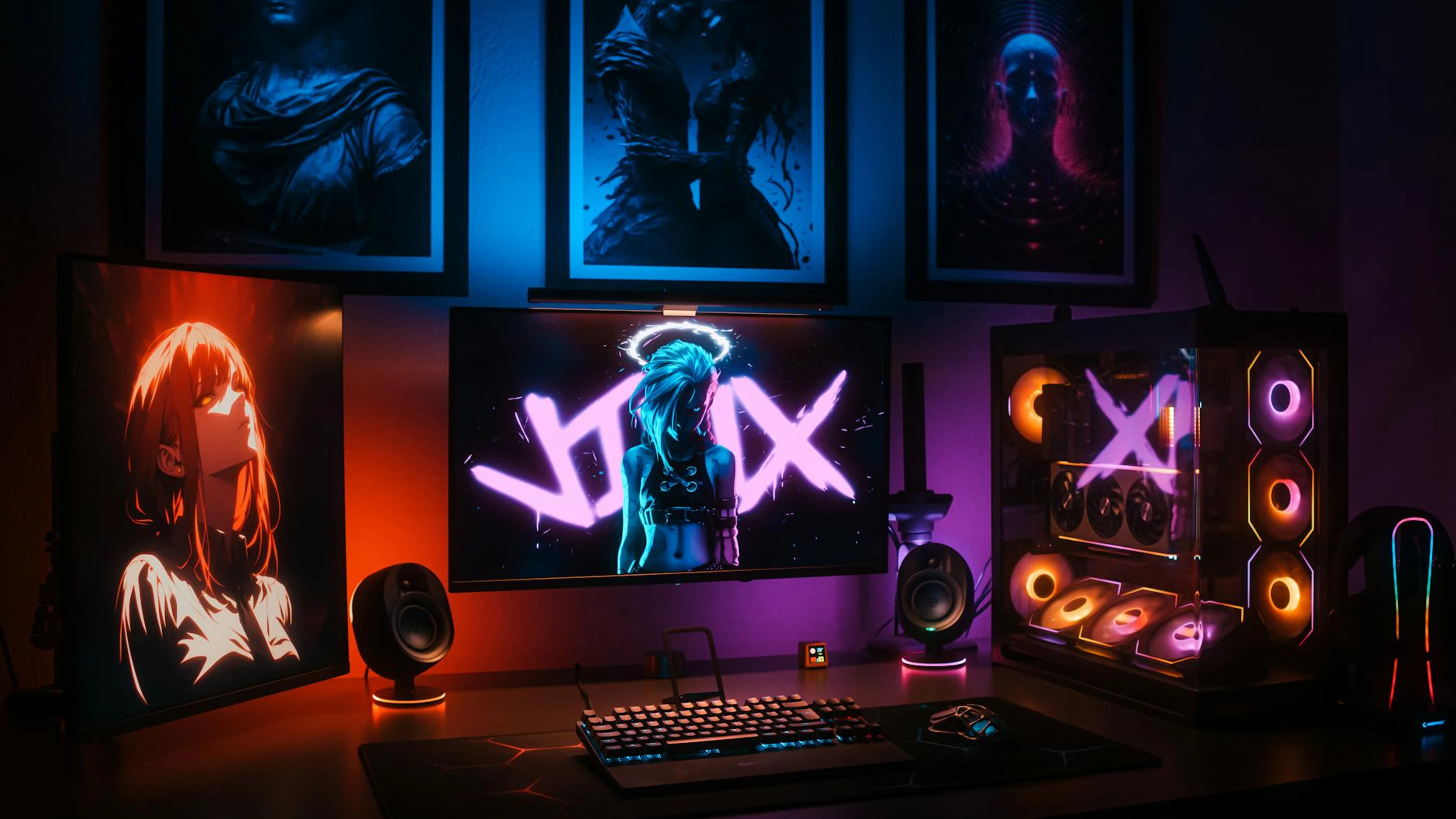 A vibrant gaming setup with neon lights, displays, and a custom PC in an artisti