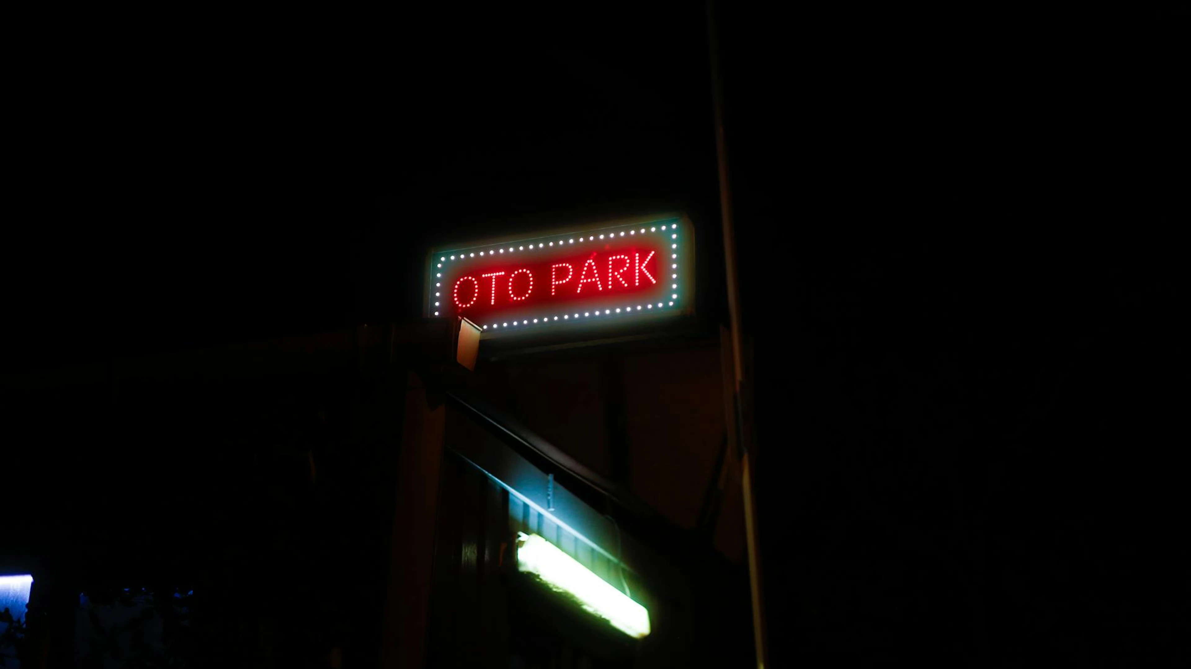 A vibrant neon sign reading 'Oto Park' glowing in the night sky, surrounded by d