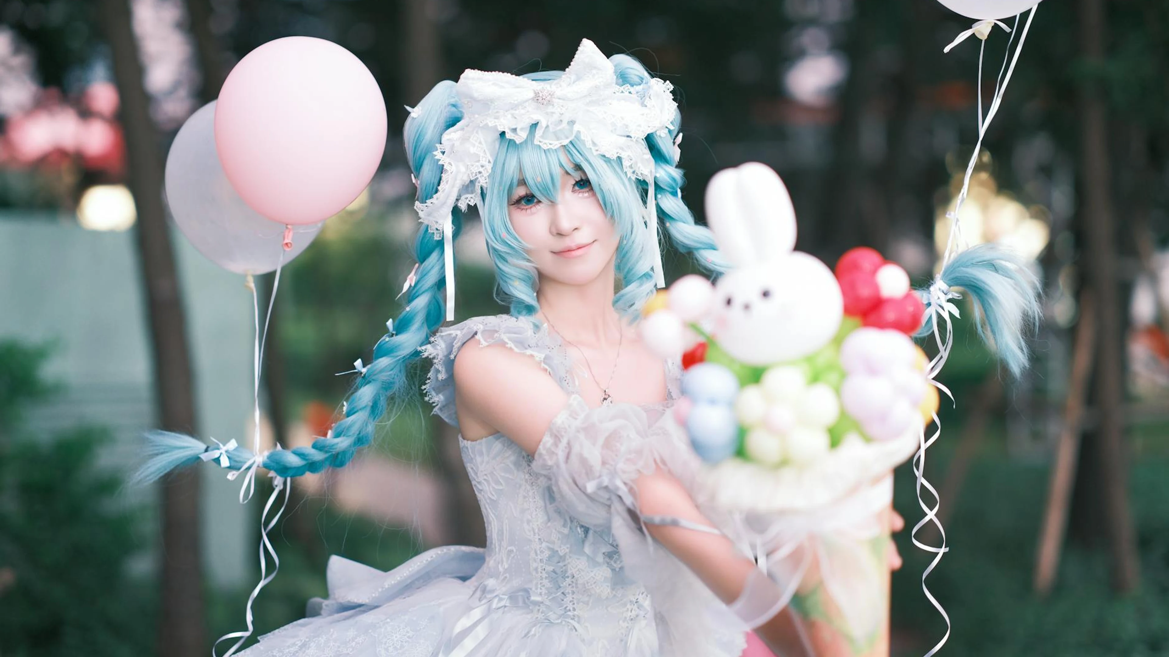 Free A whimsical cosplay portrait featuring a character with blue hair holding balloo wallpaper in 4K Ultra HD resolution (3840x2160). Beautiful anime background for your screen. No signup required.