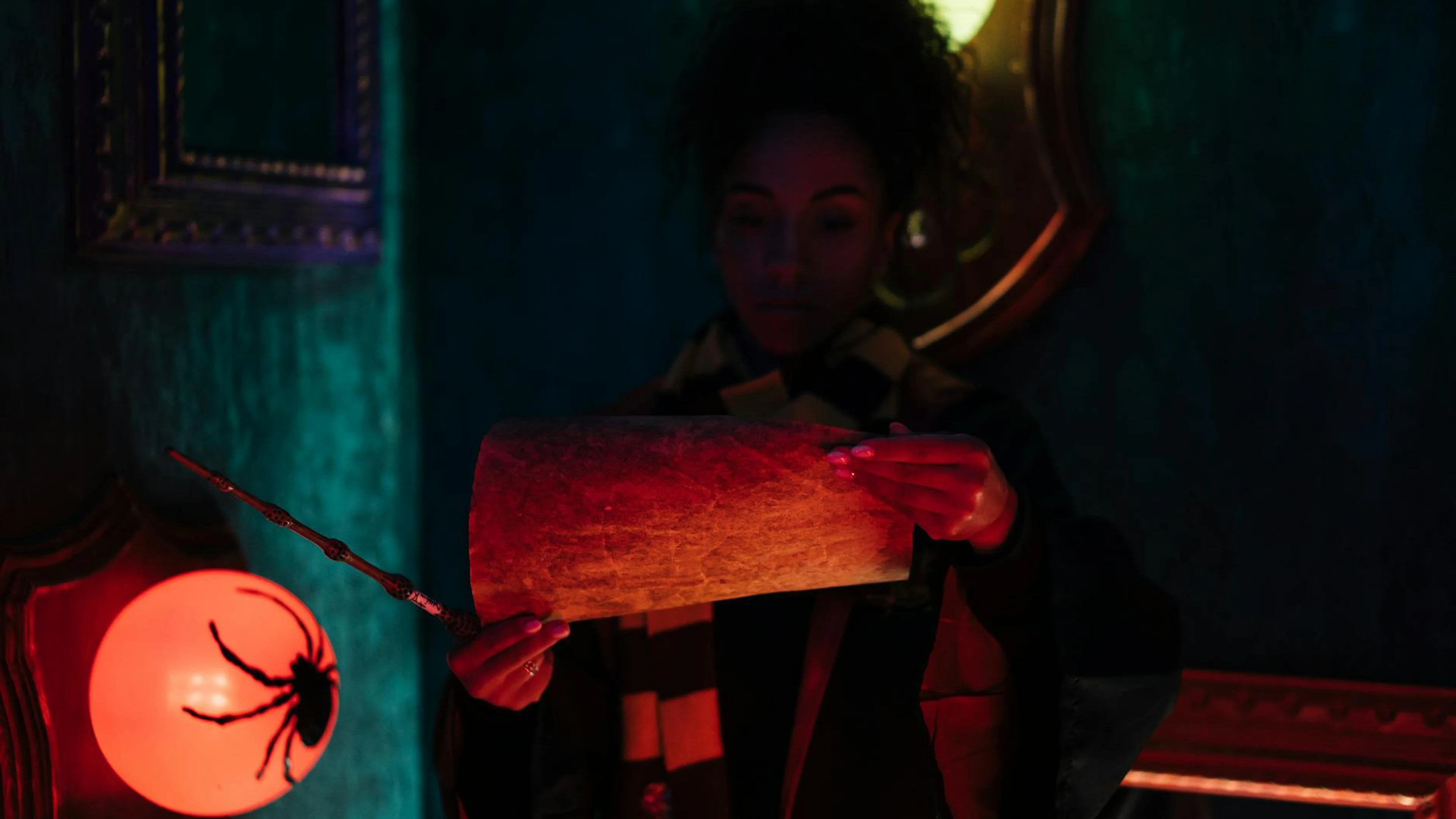 A wizardly woman holds a scroll and wand in a magical, dimly lit room.