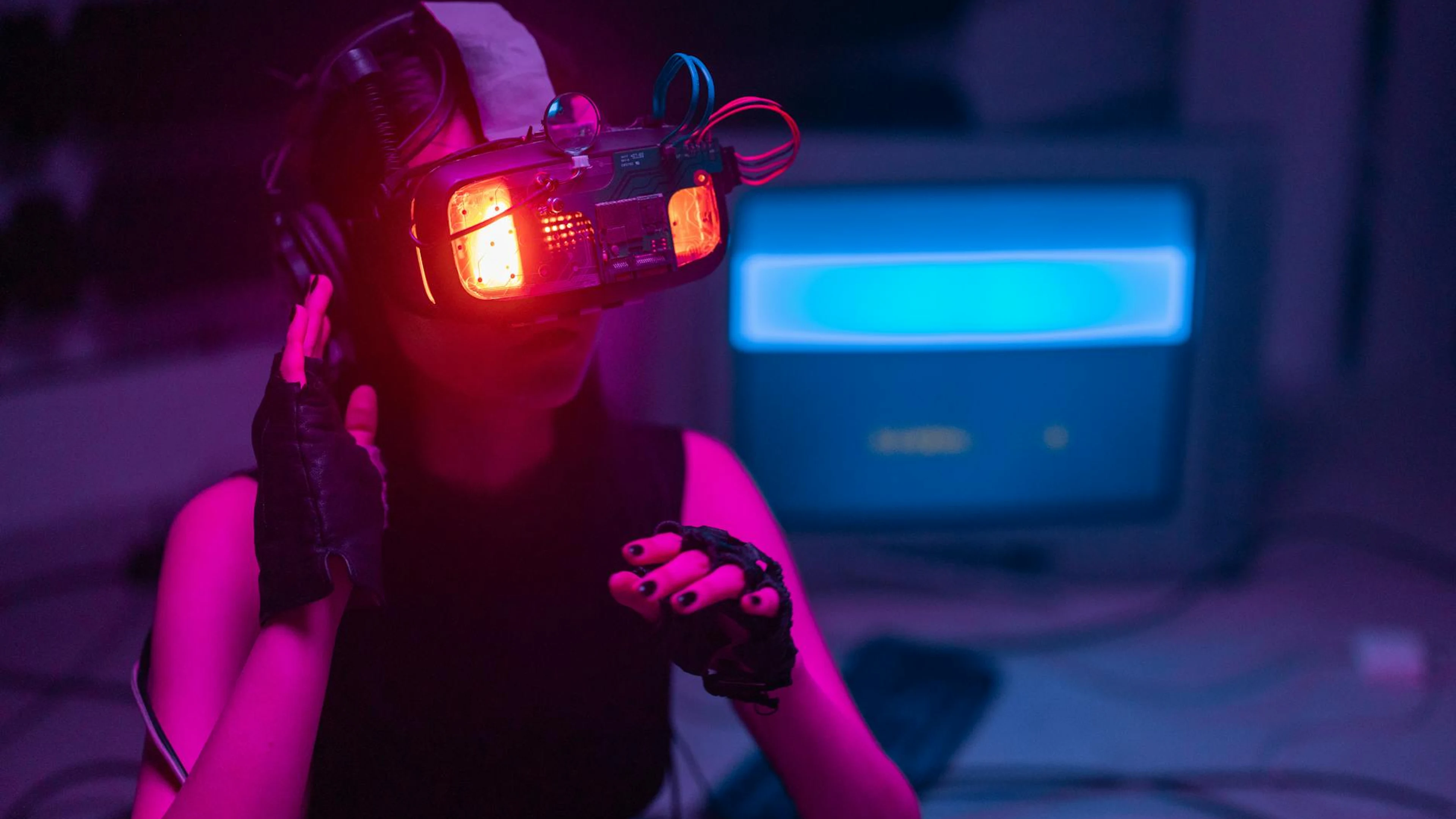 A woman immerses in virtual reality with neon-lit goggles and gloves in a tech-s