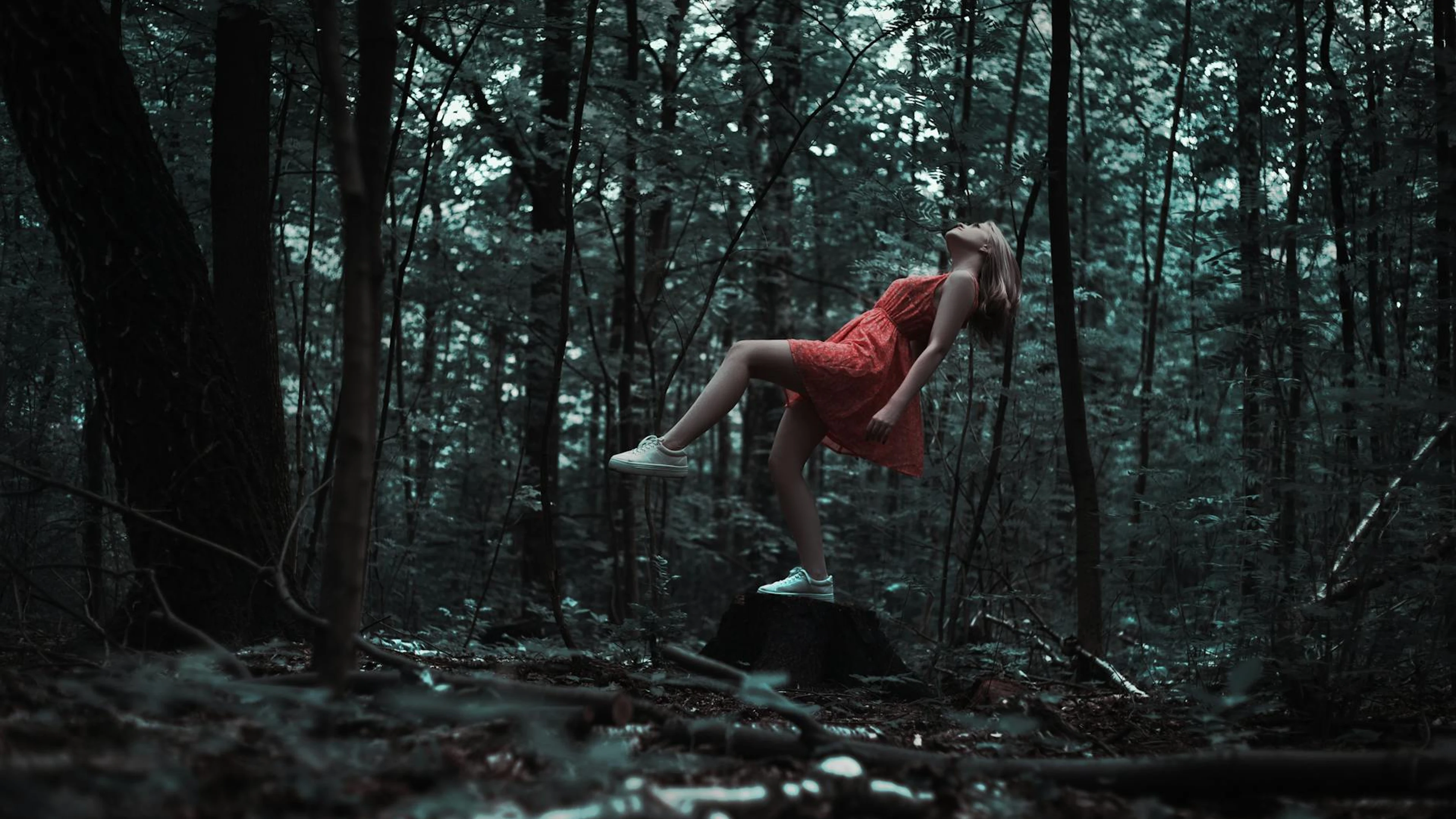 A woman in a red dress appears to levitate in a mysterious forest setting, evoki
