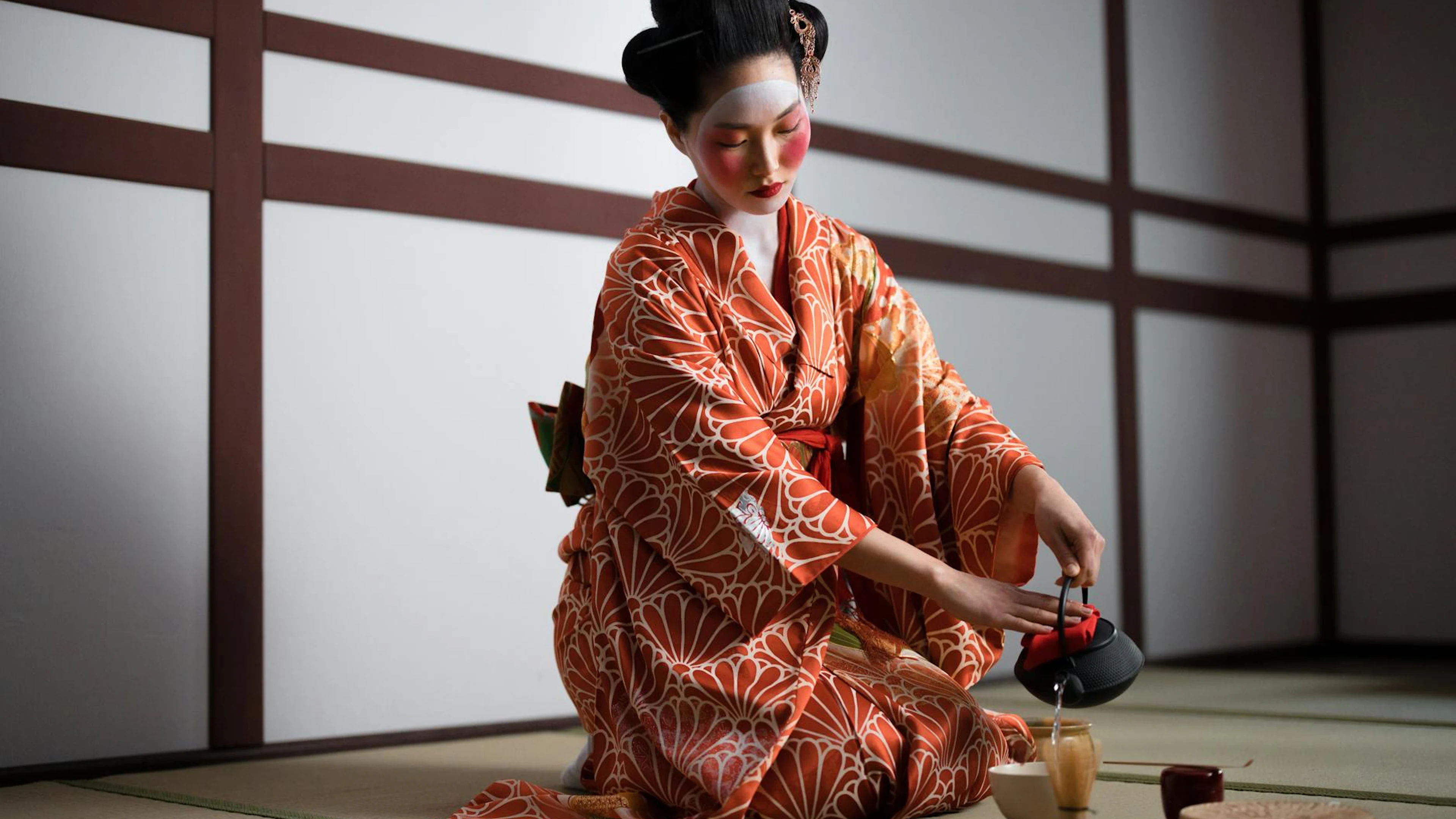 A woman performing a Japanese tea ceremony while wearing a traditional kimono.