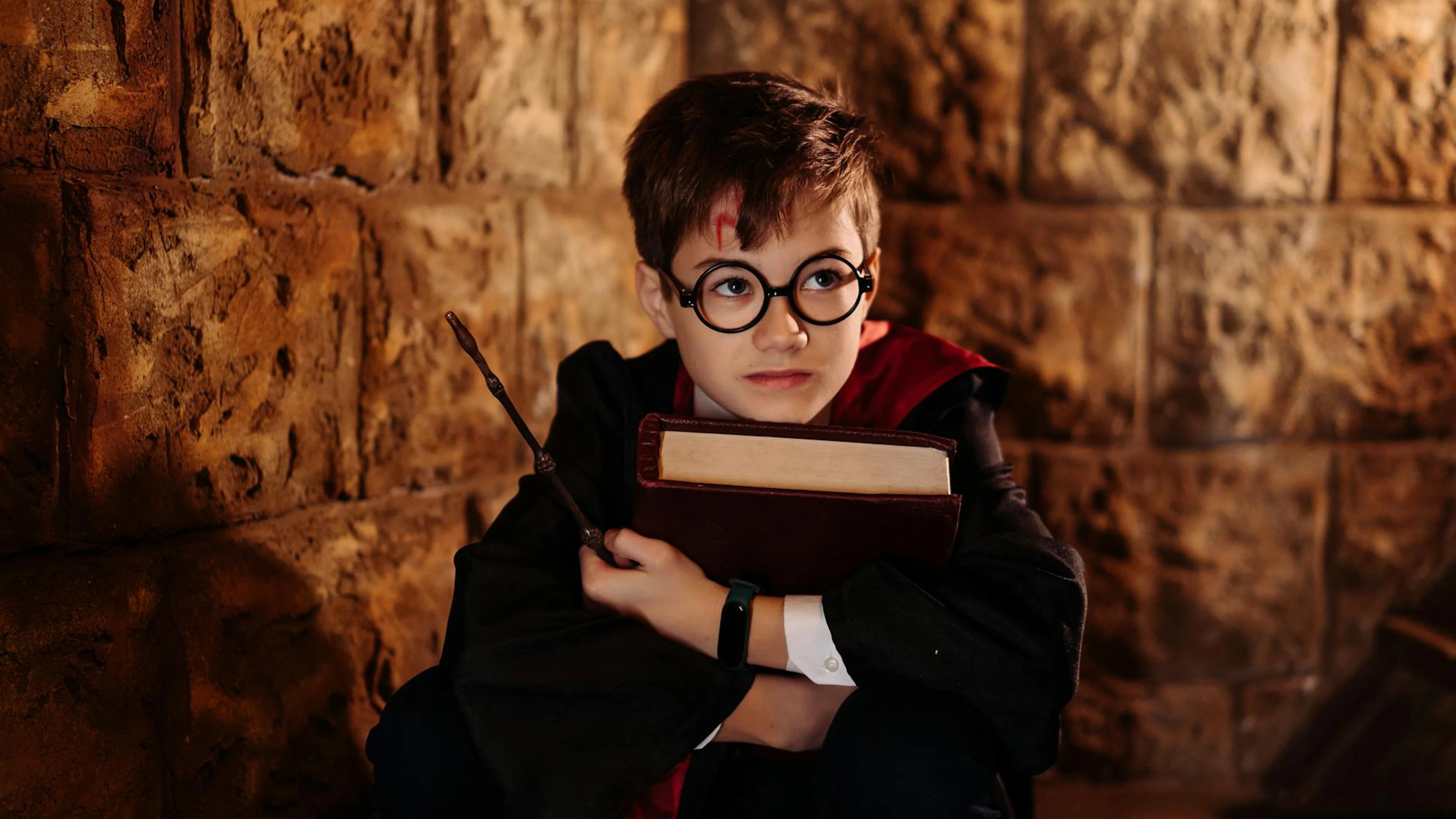 Get this stunning A young boy dressed as a wizard holding a book and wand inside a stone room. wallpaper in 4K Ultra HD quality. 3840x2160 fantasy wallpaper available for free download.