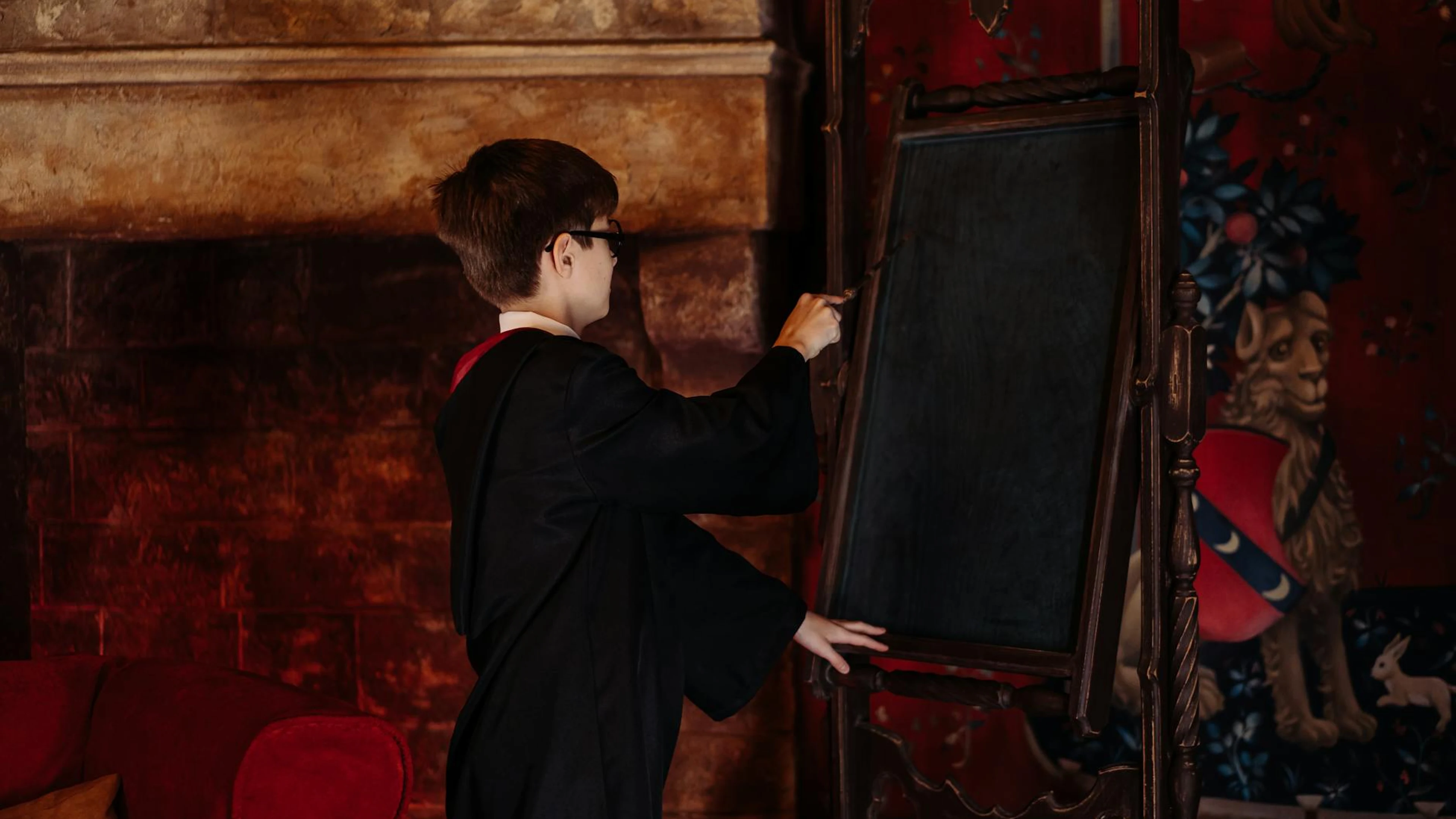 A young boy in a wizard costume writes on a blackboard in a fantasy-themed room.