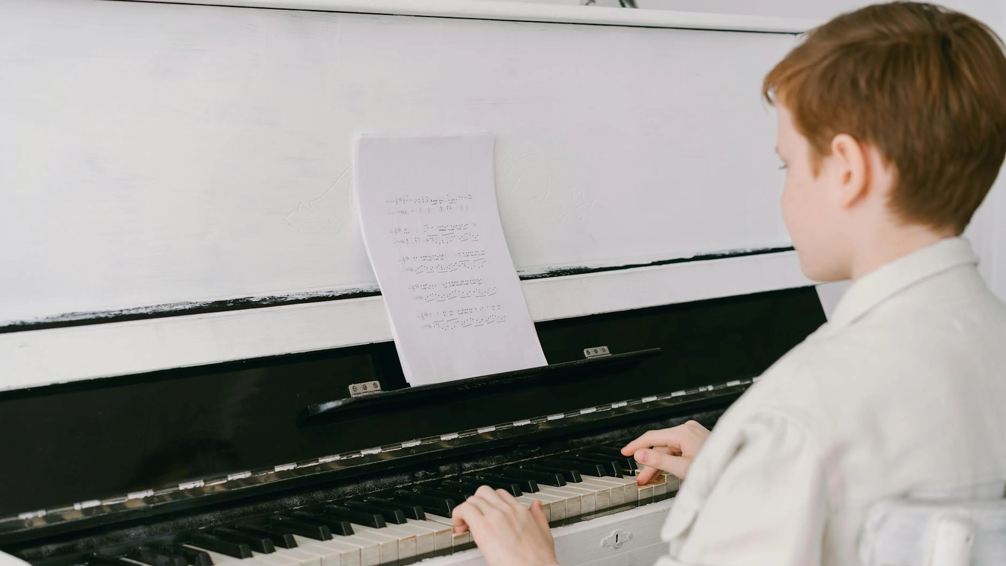 Free A young boy sits at an upright piano playing music indoors, focused on sheet mus wallpaper in 4K Ultra HD resolution (3840x2160). Beautiful music background for your screen. No signup required.